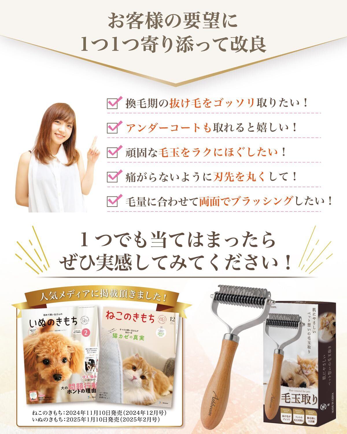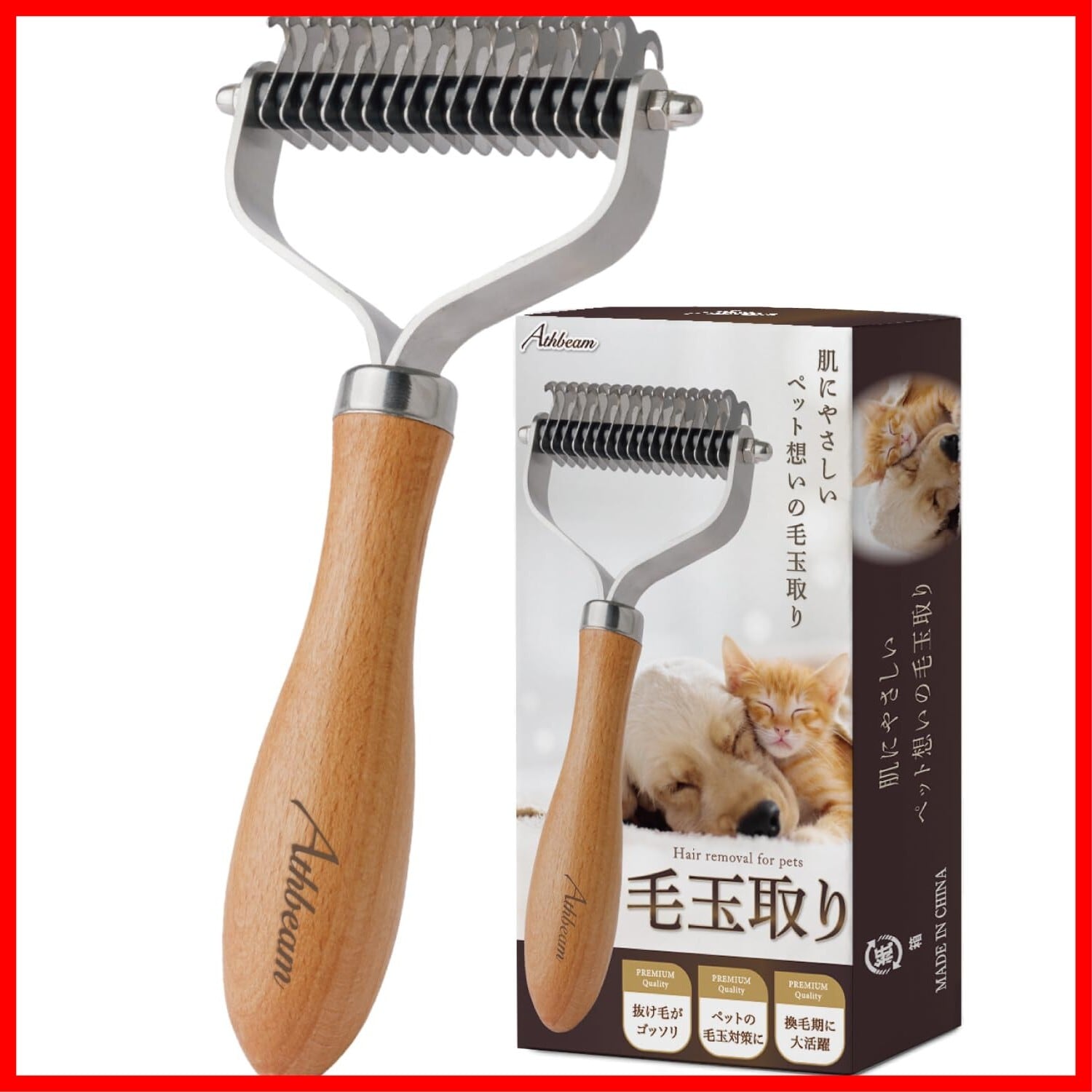 【ブラッシングを快適に】 Athbeam 毛玉取り がついに正式販売開始。 猫 や 犬 の 毛玉 が気になる…というお客様の声から生まれた 毛玉 をほぐすための ペットコーム です。 ペットコーム を使うことで、 抜け毛 が絡まないように ブラッシング をすることができます。 ペットコーム の先端で肌が傷つくことを防ぐため、先端が丸くなるよう改良いたしました。