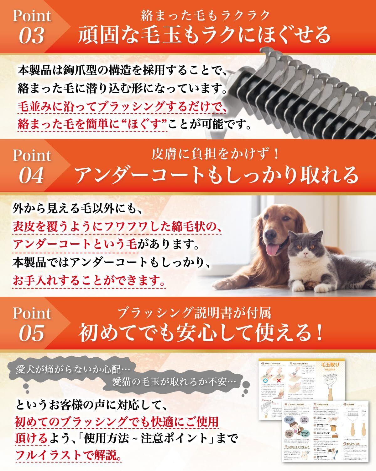 【フルカラー説明書が付属!】 本製品には手軽にペットに ブラッシング できるよう、フルカラー説明書にて使用方法や注意ポイントを丁寧に解説させていただきました。女性のお客様1人でも使い始められるよう、イラスト14枚で徹底解説しています。