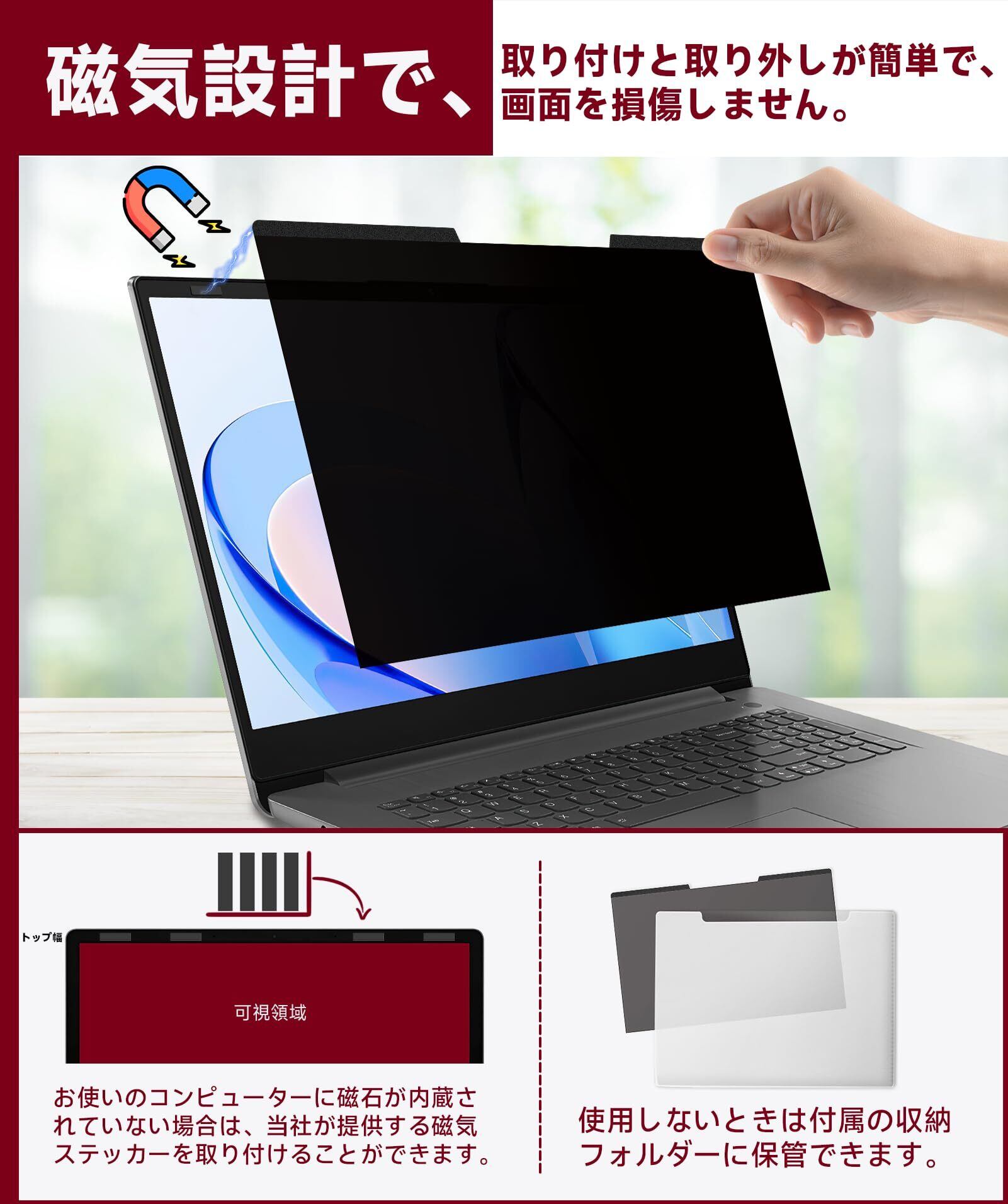 【磁気設計、使いやすく、取り付けが簡単】 簡単な手順で簡単に覗き見防止フィルムを取り付け・取り外しができ、保管に便利なフォルダーも付属しています(パソコンにマグネット吸着機能がない場合は、マグネットステッカーも付属しており、自分でスクリーンプロテクターを取り付けることができます)。