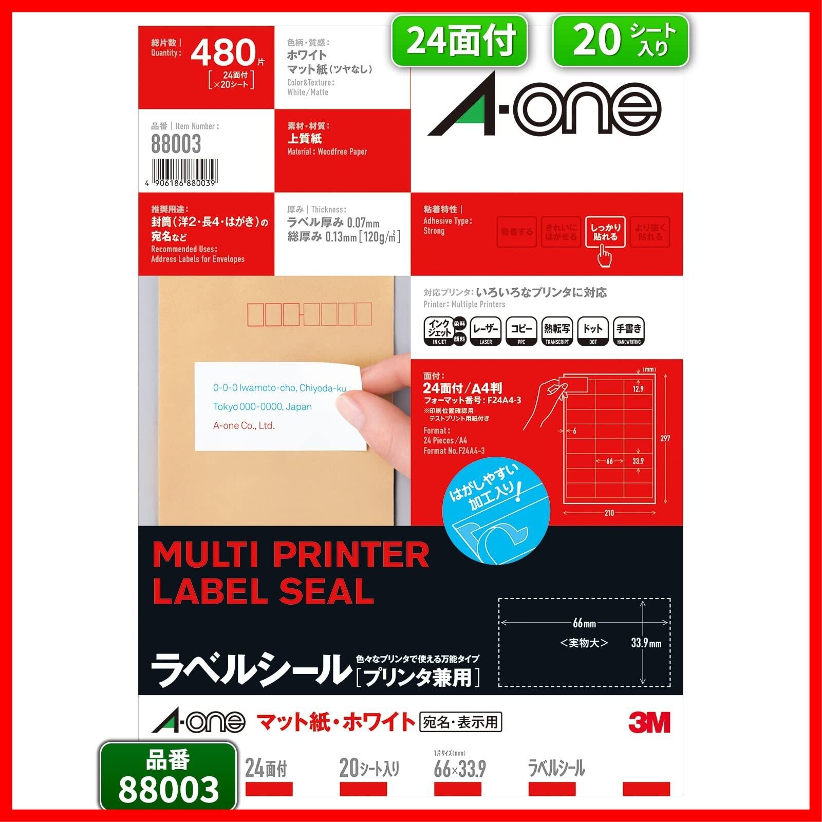 エーワン ラベルシール 24面 宛名 表示用 20シート 88003