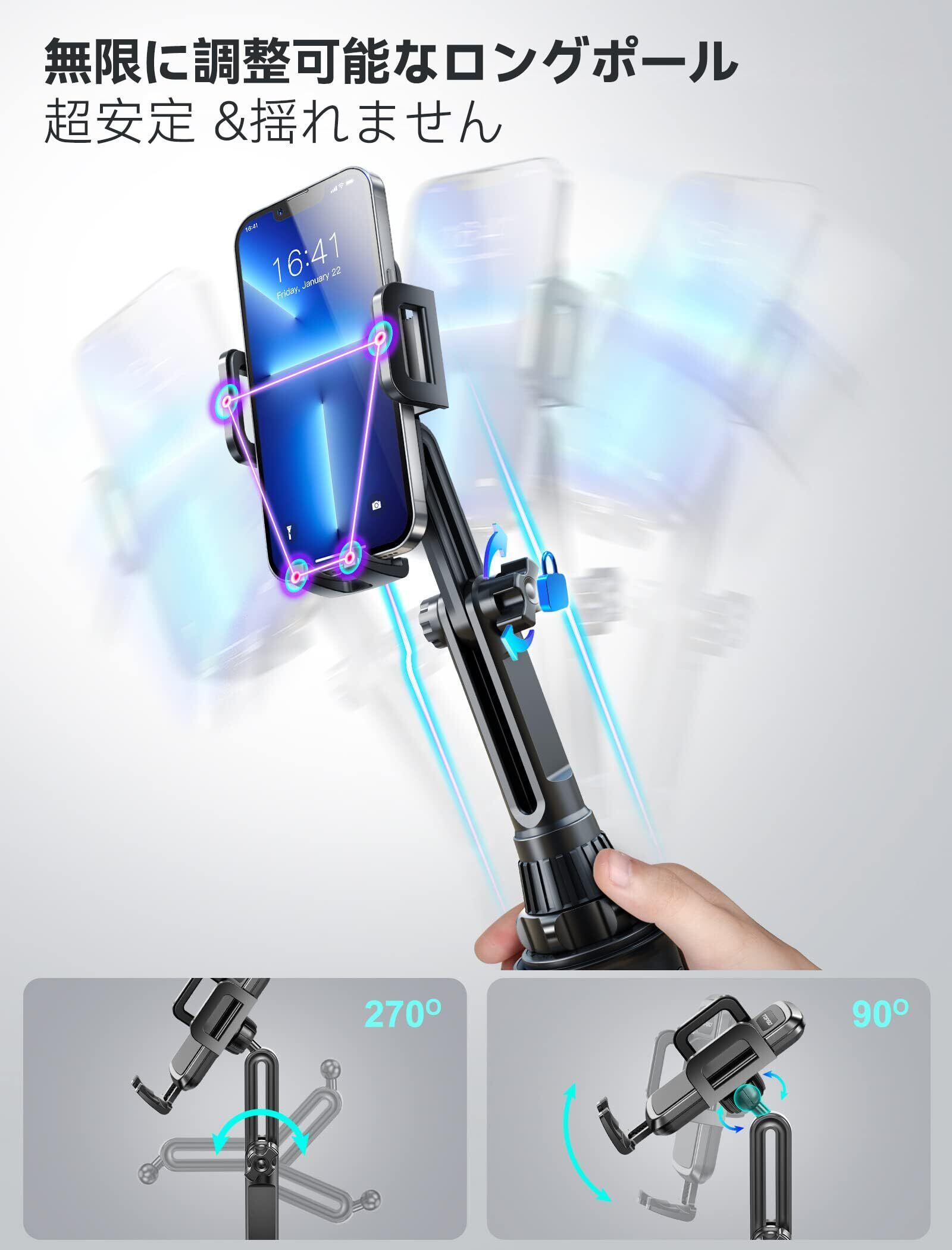 【2023年進化型・機械式伸縮延長ポール・目線を落とす必要なく】このスマホホルダー 車 ドリンクホルダーは、より安定して高さ調整可能な機械式伸縮延長ポール、270°の動きやすいボールジョイントで、視界と操作性をさらに高め、目線を落とす必要なくスマホの装着部分は360度回転可能で、縦・横・上下・左右など運転中のお好みやニーズに合わせて、最適な視野角に調整できます。通話でも、ナビでも、音楽を聴いていても、充電中でも、安全運転を確保できます。