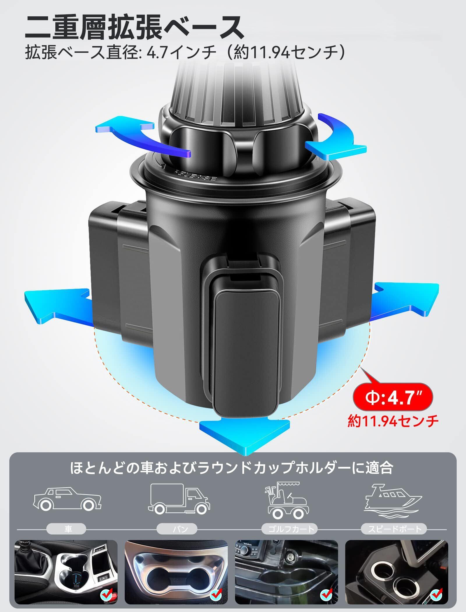【拡張可能なベース・取り付け簡単】延長器を接続すると、最大直径10.2 cmまで、ほぼすべてのカップホルダーにフィットします。自動車、RV、SUV、トラック、タクシー、テスラ、ヨット、ゴルフカートだけでなく、ベビーカー、ランニングマシン、ソファのドリンクホルダーにもフィットします初心者でもすぐ使いこなせるように、車への取り付けがとても簡単です。