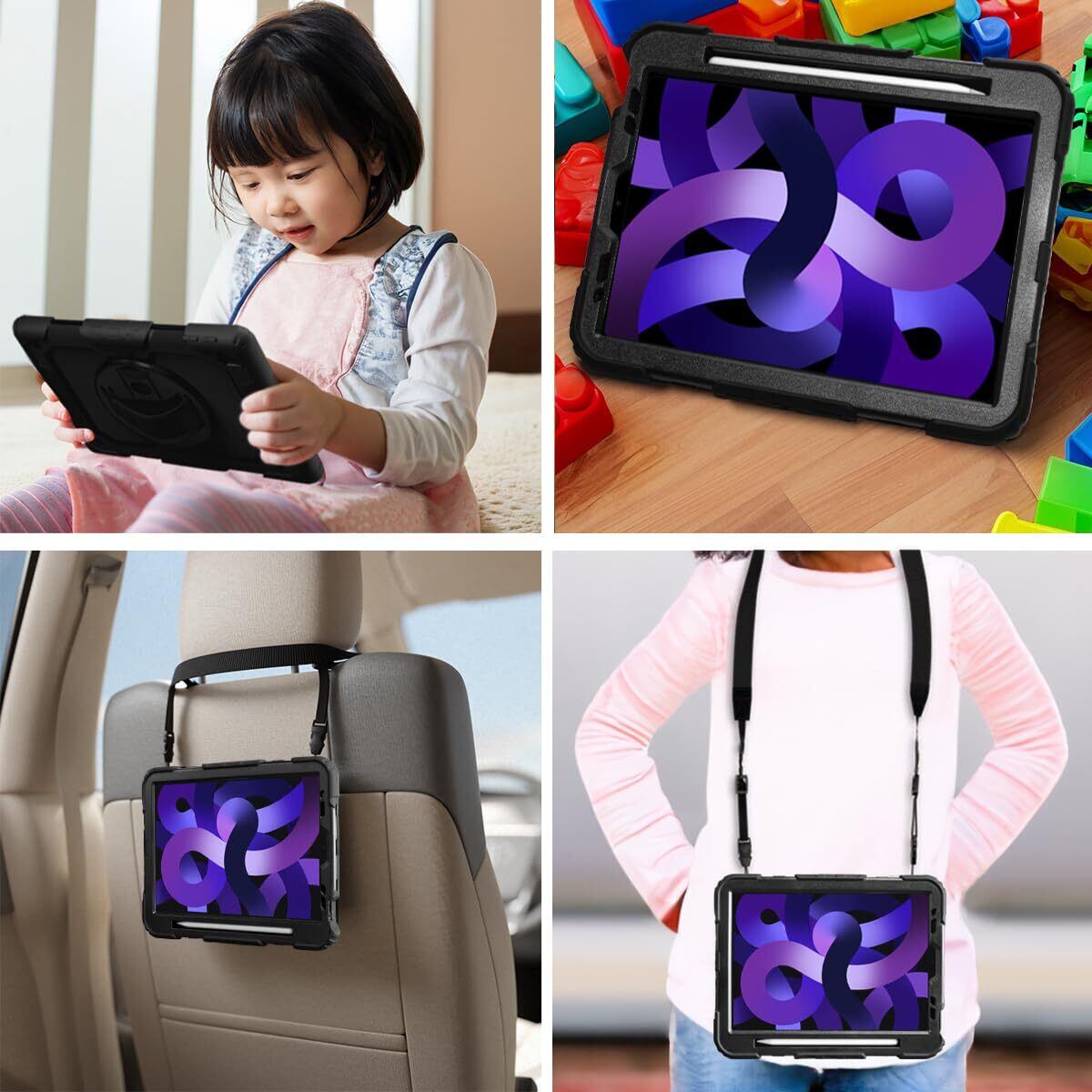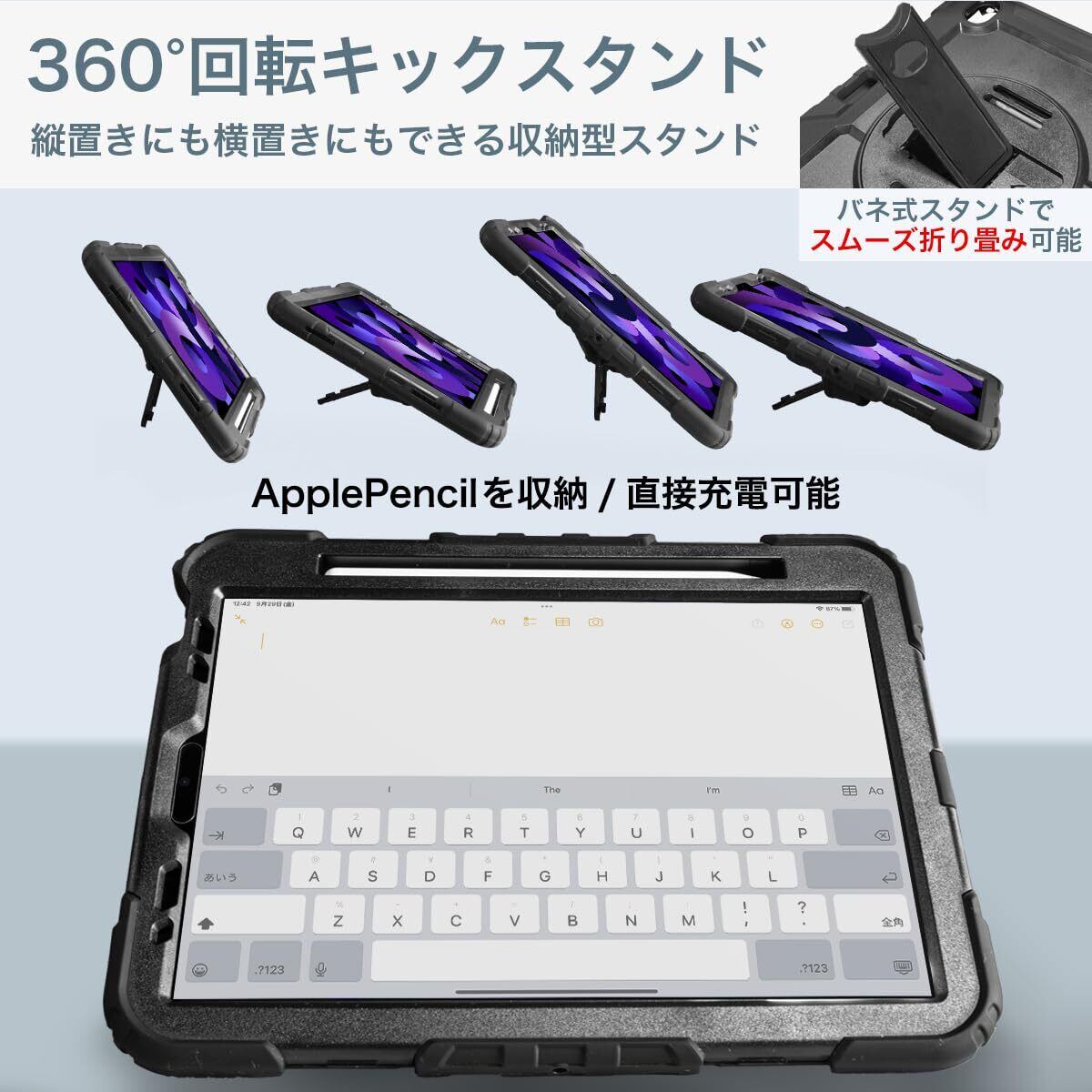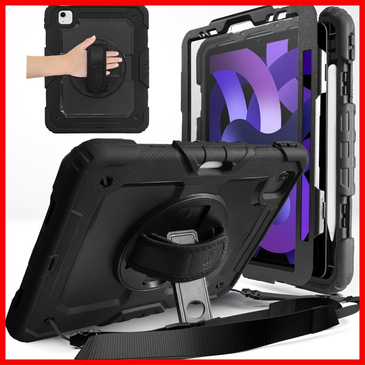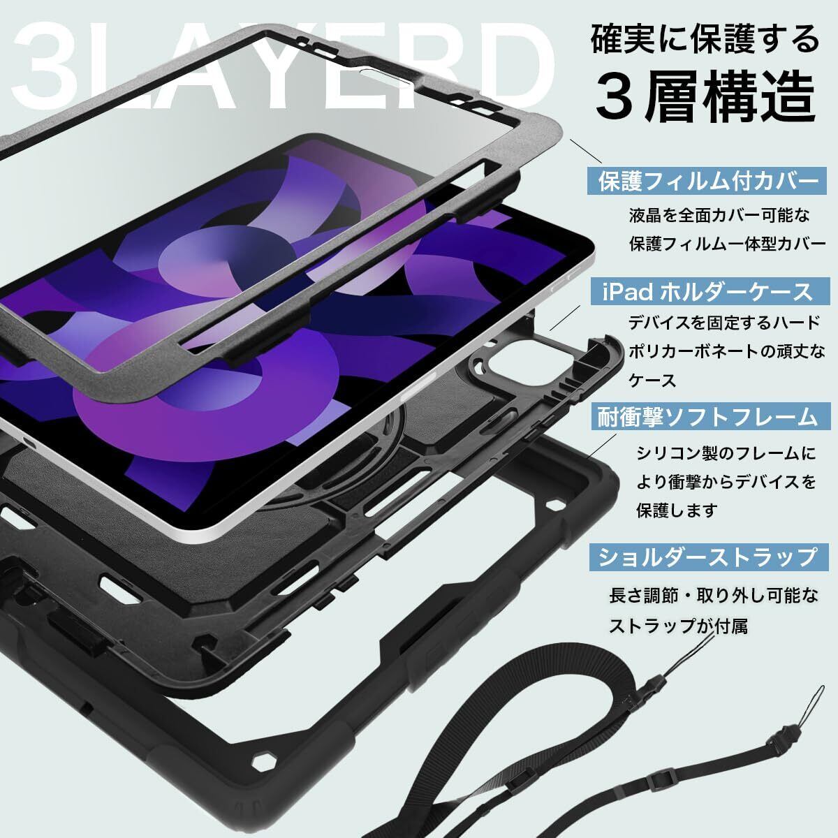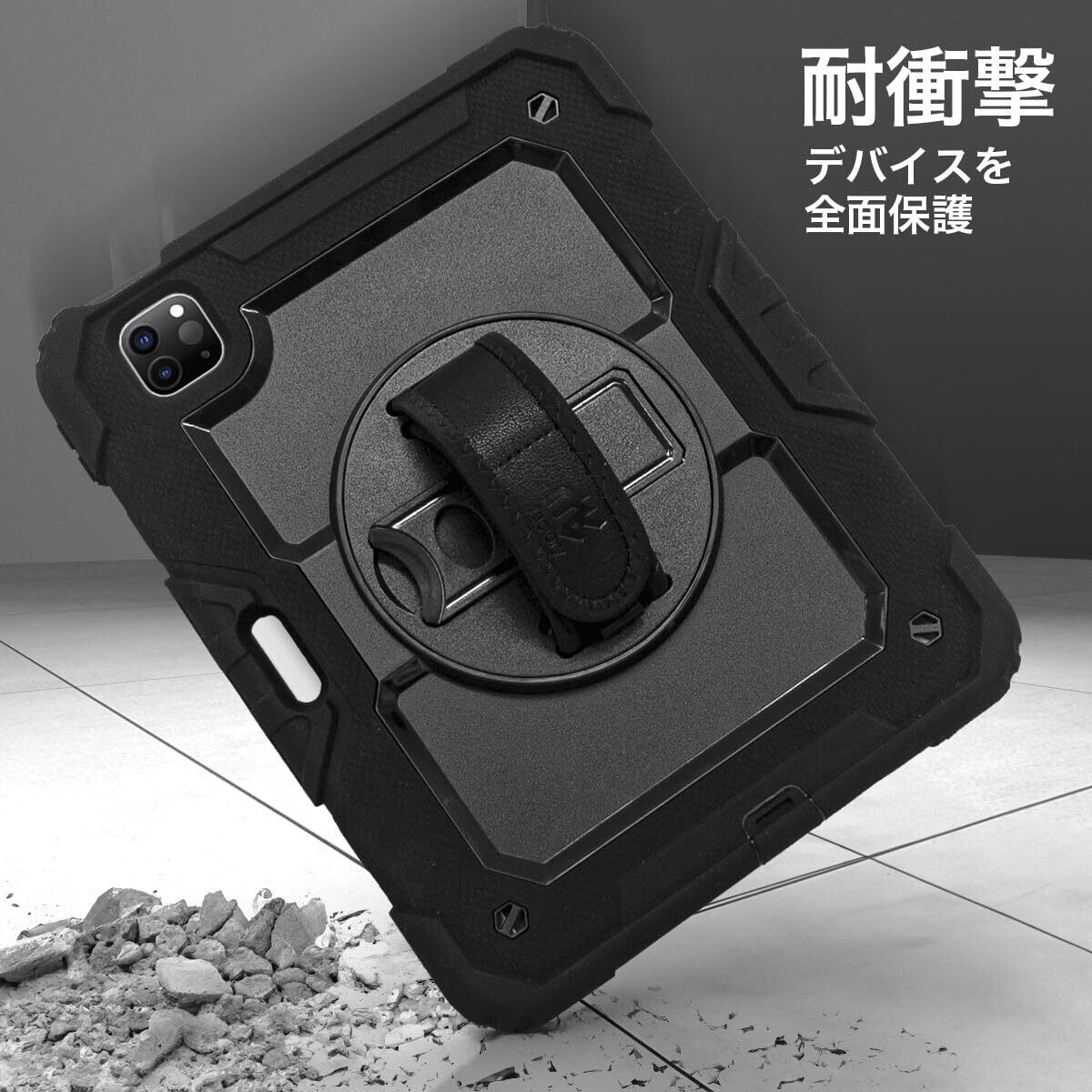 MS factory iPad Air 第5世代 用 ケース 第4世代 Air5 Air4 Pro 11インチ 第4/3/2/1世代 アイパッド カバー 耐衝撃 ペン収納 キッズ 保護 フィルム 付き ショルダー ハンドストラップ 360°回転 スタンド ブラック 黒 IPDA4-SHOCK-BK