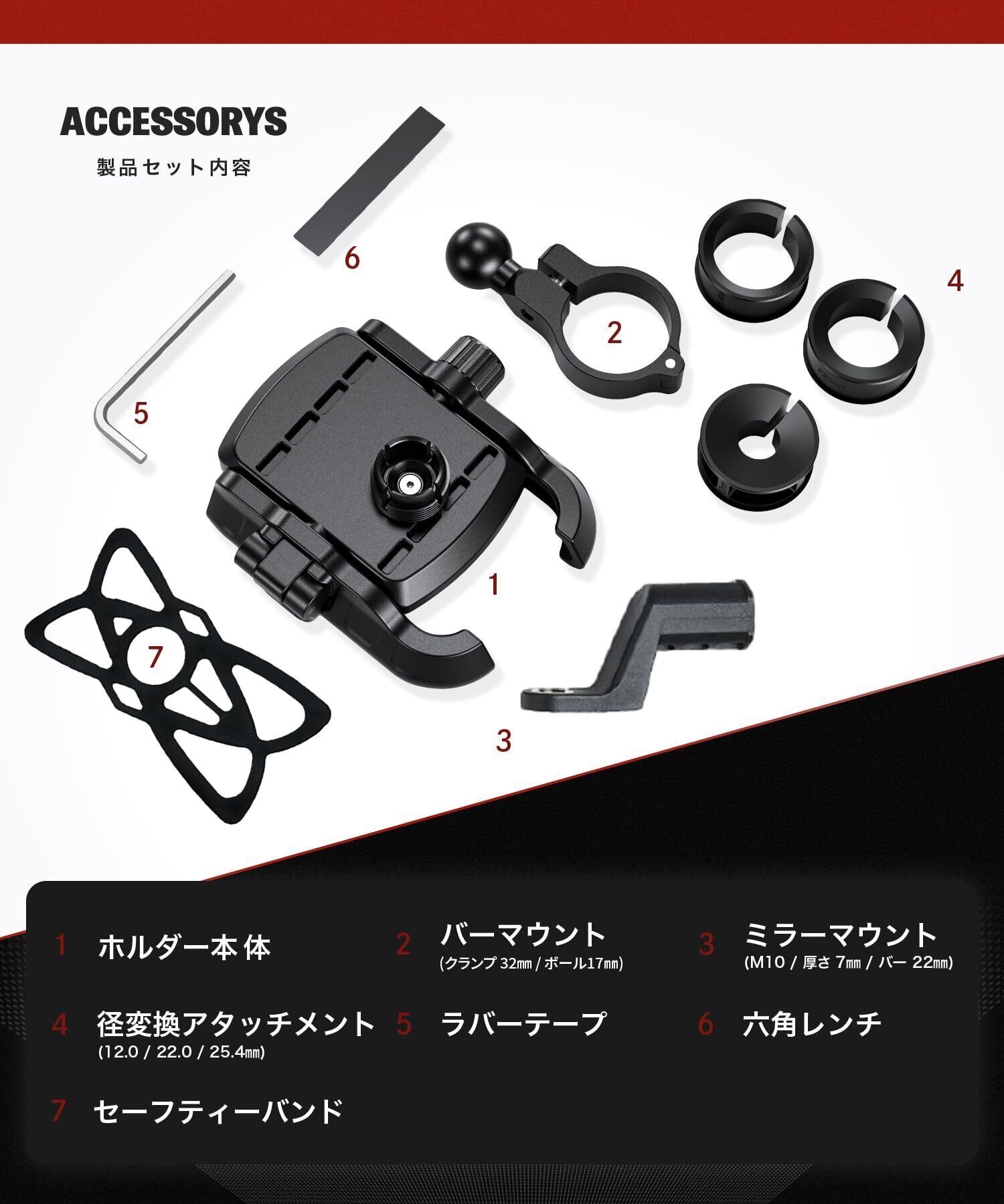【商品仕様】 ■サイズ:アーム深さ90mm、アーム幅70~88mm、厚さ14mm以下 ■材質:アルミニウム合金(ホルダー面/マウント)+強化プラスチックPA66+GF ■重量:152g ■内容:本体(17mmボール)、バーマウント(17mmボール/32mm/幅15mm)、 ミラーマウント(クランプ22mm/M10/厚7mm)、径変換アタッチメント(12/22/25.4mm)、2mmラバーテープ、セーフティーバンド、六角レンチ■取扱説明書(オンラインのみ):環境負荷の軽減を目指した脱炭素化への取り組みとして、紙媒体での同封を控えさせていただいております。Kaedear公式サイトの各商品ページから閲覧またはダウンロードが可能です。 ■ブランド:Kaedear( カエディア ) ■期間:1年(ご購入日と同日が期限) ■万一に備え、セーフティーバンドKDR-SFB-Cをご活用頂く、もしくはストラップKDR-SFB-S、カラビナなどを活用し、ホルダーセット後にハンドルと繋げる事で不測の事態に備える事をおすすめしています。
