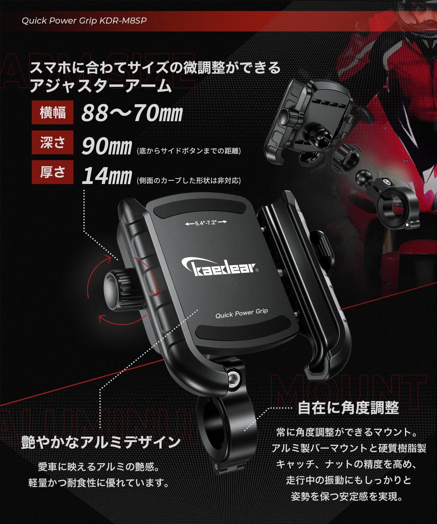 【クイックパワーグリップ】 万力の様に締め付け圧でスマホを固定するのが特徴のパワーグリップがクイックレバーに進化。レバーを倒した時にスマホがしっかり固定される位置に左のダイヤルを回してアームを調整します。レバーを起こすとスマホを上に抜き取る事ができます。スマホを差し込みレバーを倒すとスマホが固定されます。構造上ホルダーのサイズを小さくできます。「ハンドル周りに大きなものを取り付けたくない。」、「夏場のスマホの冷却を考慮したい」、「スマホをホルダーに取り付けたままカメラを使用したい。」、「手動でガッチリ固定しないと気持ち悪い」そんな方にオススメなモデルKDR-M8SPです。