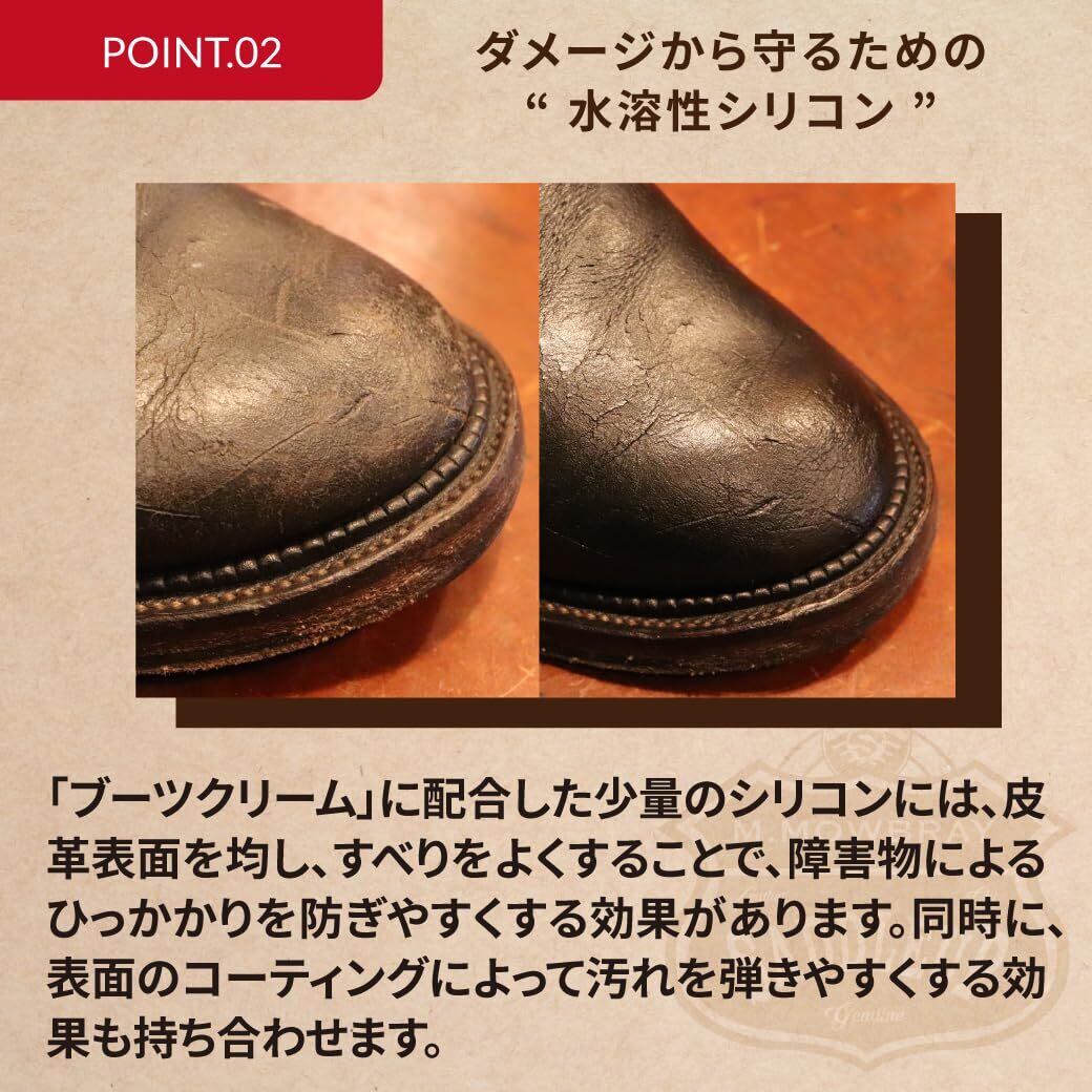 カルナバワックスとオイルを配合したエイジングをたのしむブーツのためのケアクリームです。経年変化した革の風合いを残し、あえてスレ傷を活かした「無骨なエイジング」をたのしみたい方にはエンジニアブラック、ブラックチェリー、シガーブラウンがおすすめ。革の色抜けや茶芯のエイジングをたのしみたい方にはニュートラルがおすすめです。補色、栄養、ツヤ出し効果がありながら、革の吸湿性や通気性にはほとんど影響しないクリームです。 用途:一般的な表革、オイルドレザー、クロムエクセルレザー、ホースハイドなどの靴、ブーツ 使用方法:塗布用のブラシや布(コットンなど)にクリームを少量取り、靴に塗り込みます。豚毛ブラシでブラッシングするとツヤが出やすくなります。最後に布(クロスなど)で乾拭きすると自然なツヤが出てきます。※靴は汚れが付きやすいため数回に1度クリーナーで古いクリームや汚れを落としてからご使用ください。 注意:・使用後は完全にフタを閉めて保管してください。・シミ、色ムラができる、変色する特殊な皮革もあるため、目立たない部分でテストしてからご使用ください。