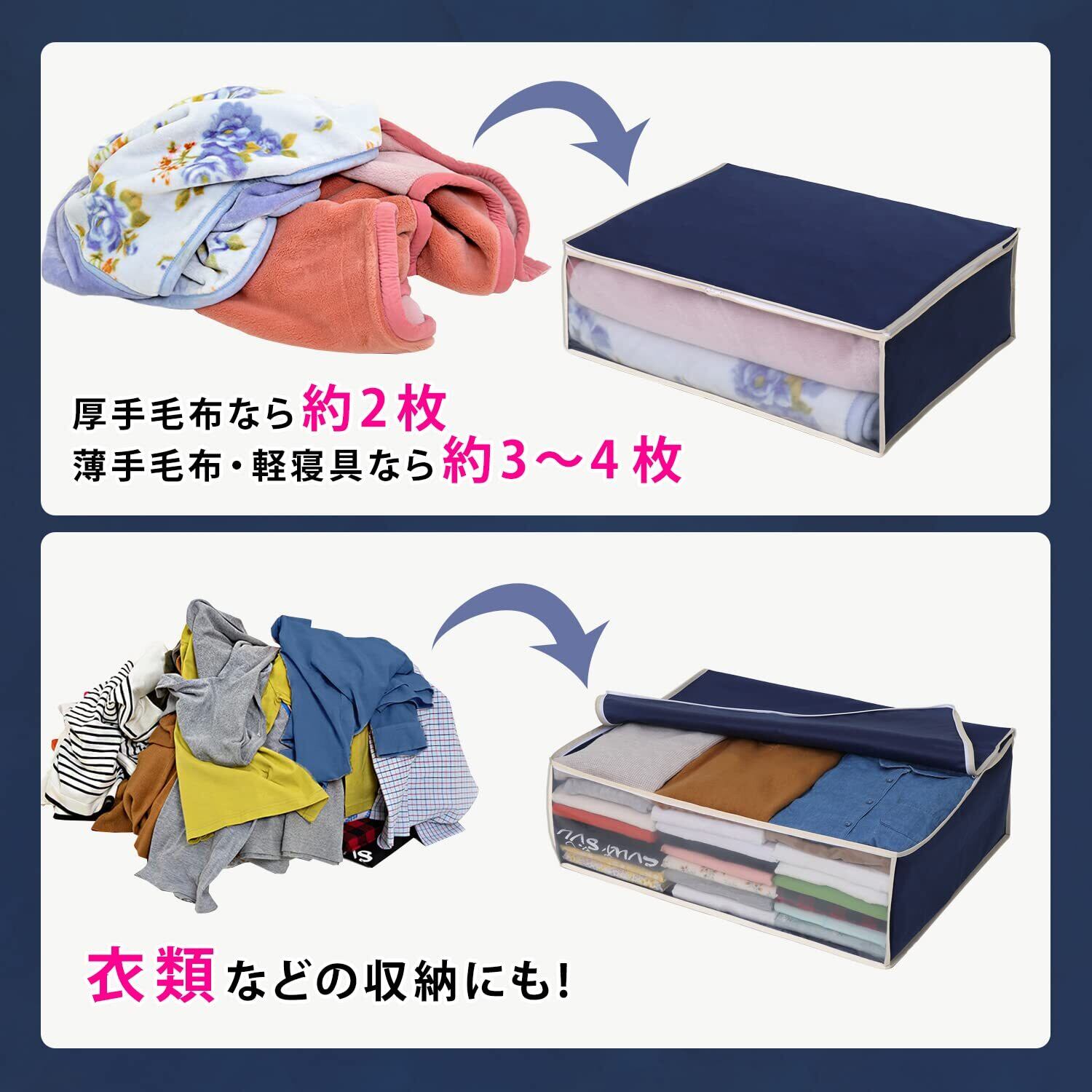 【商品仕様】:サイズ/約幅70×奥行53×高さ23cm、カラー/ネイビー、内容/2枚、収納目安/厚手毛布約2枚(袋1枚あたり)、材質/ポリプロピレン、ポリエチレン