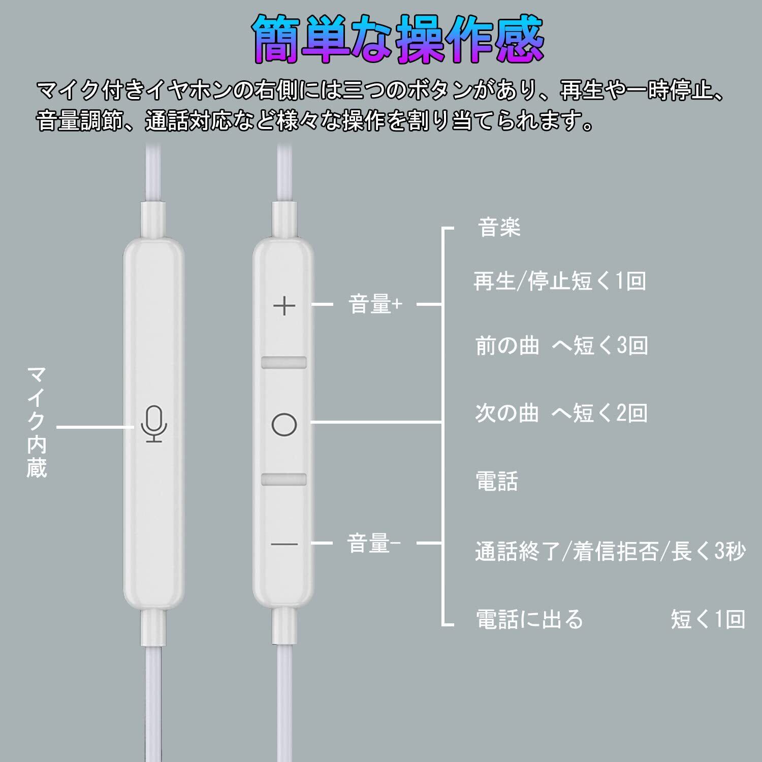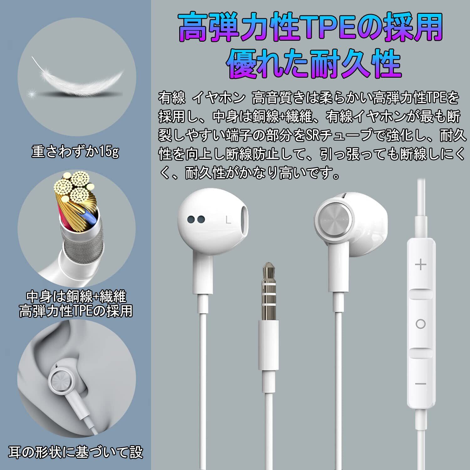【優れた耐久性】有線 イヤホン 高音質きは柔らかい高弾力性TPEを採用し、中身は銅線+繊維、有線イヤホンが最も断裂しやすい端子の部分をSRチューブで強化し、耐久性を向上し断線防止して、引っ張っても断線しにくく、耐久性がかなり高いです。厳しい折り曲げテストを受けてあるので、お安心にご使用できます。また、1年間の品質と30日以内に無条件返品のサービスを提供しておりますので、安心してご購入ください。