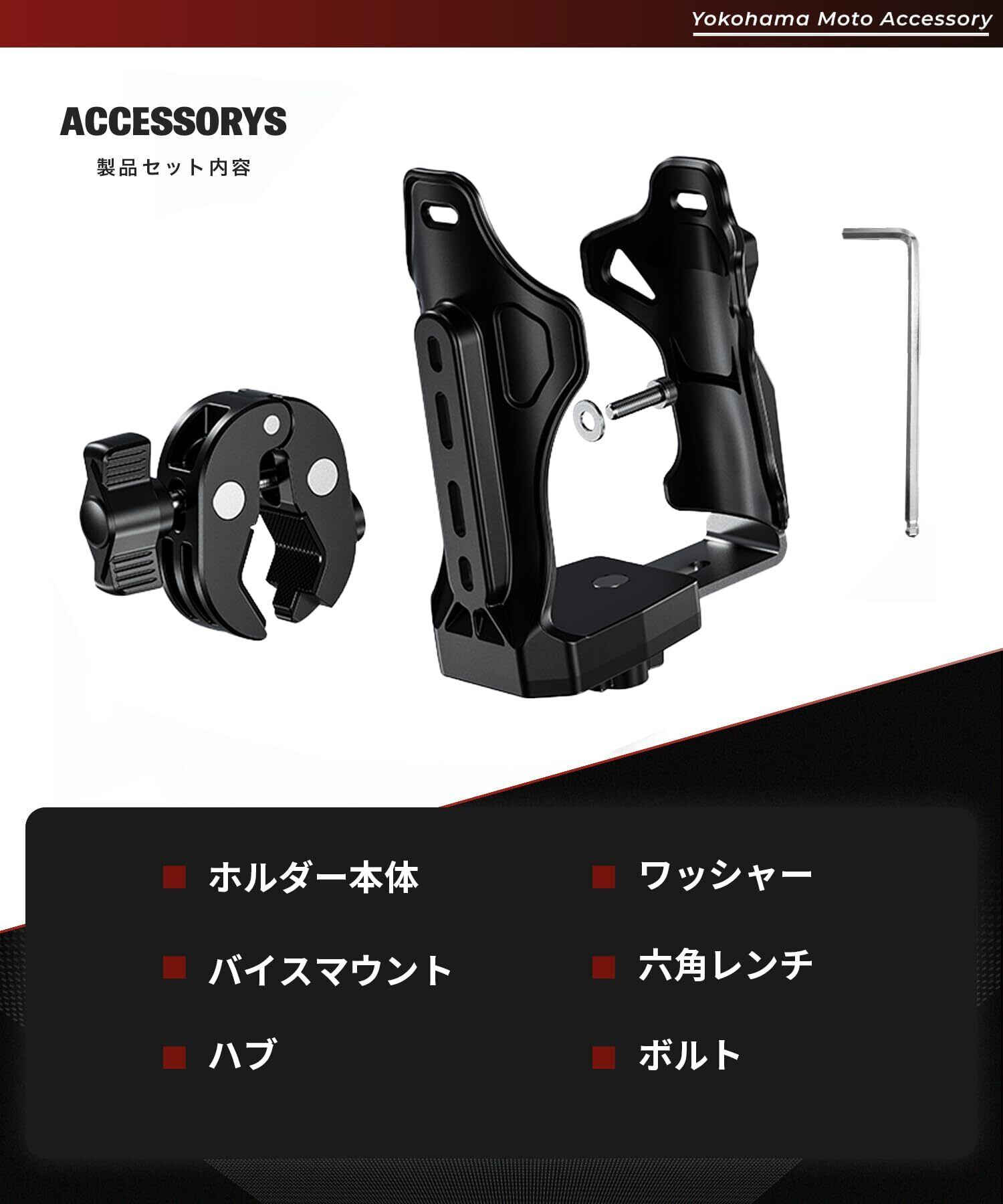 【商品仕様】 ■ホルダーサイズ:縦159mm、奥行き117~74mm、ボトル直径50mm~90mm前後■素材:GF+PA66■重量:215g ■セット内容:本体、バイスマウント(12.7-45mm)、取り付け工具(六角レンチ)■取扱説明書(オンラインのみ):環境負荷の軽減を目指した脱炭素化への取り組みとして、紙媒体での同封を控えさせていただいております。Kaedear公式サイトの各商品ページから閲覧またはダウンロードが可能です。 ■ブランド:Kaedear(カエディア)