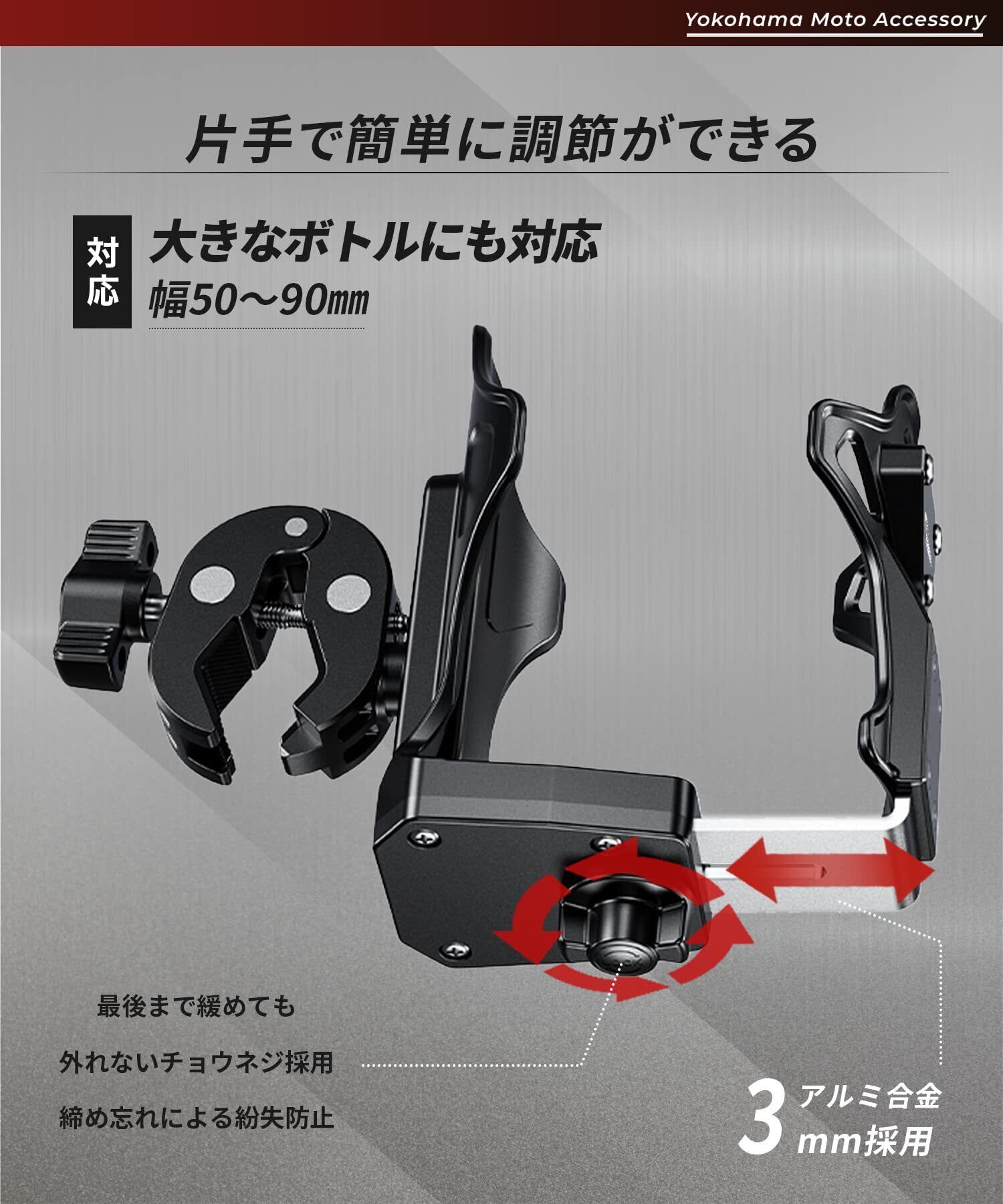 【 ボトルホルダー 】 カエディア スマホホルダー に採用している強化プラスチックの材質を使用した ドリンクホルダー 。最も負担が掛かる ホルダー の調整軸を厚さ3mmの アルミ ニウム合金板で構成。大容量の ペットボトル や 水筒 にも対応。
