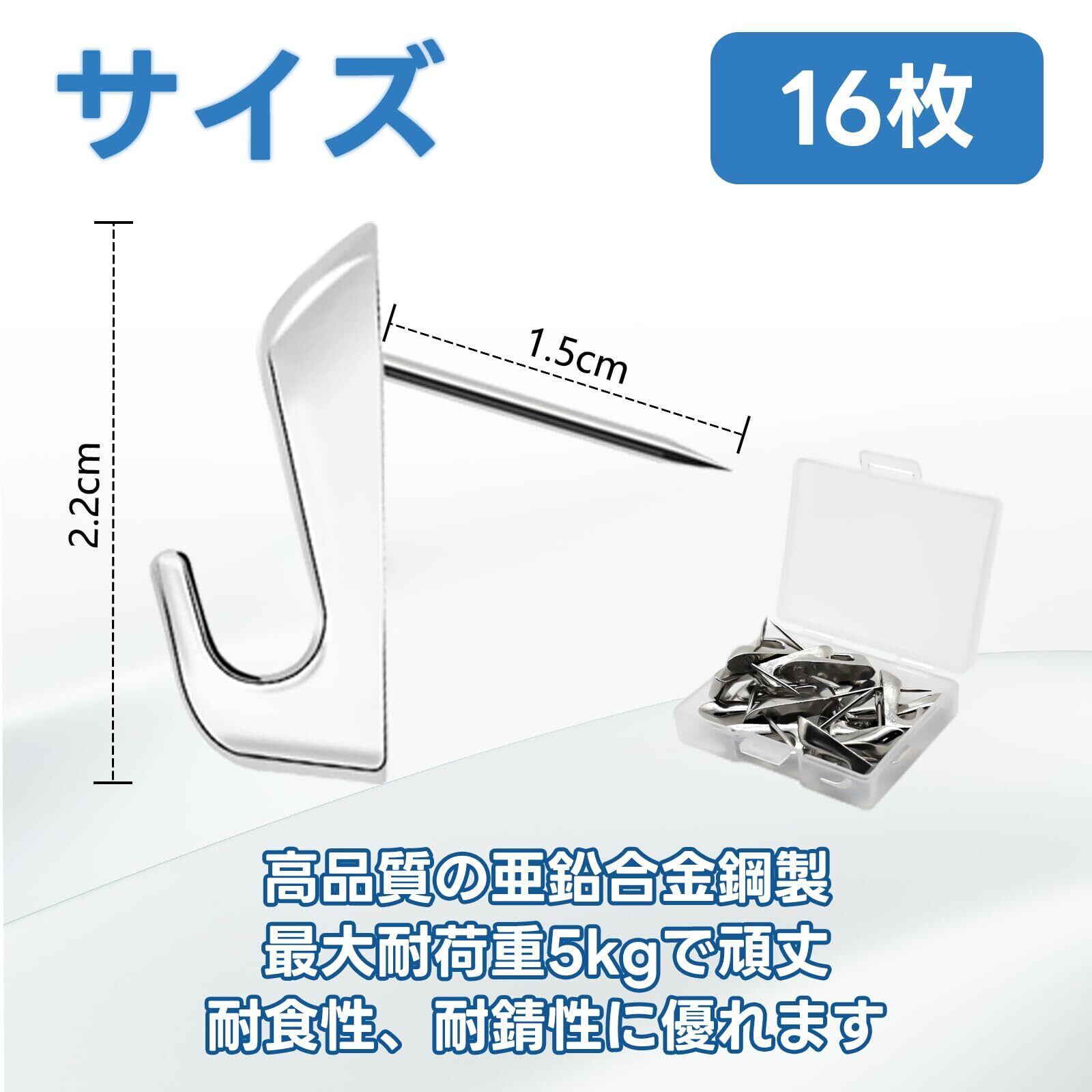 【頑丈な素材で安定した使用感】セット内容は画鋲フック×16と収納ケース×1となります。画鋲フックは高品質の亜鉛合金鋼製を使用し、頑丈で耐食性や防錆性に優れています。ピンは約30°斜め下に刺すため、固定力が高くて、最大耐荷重は5kgで、重めな物でもしっかり支えます。