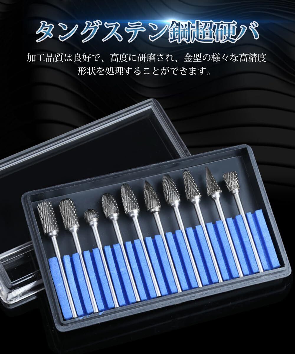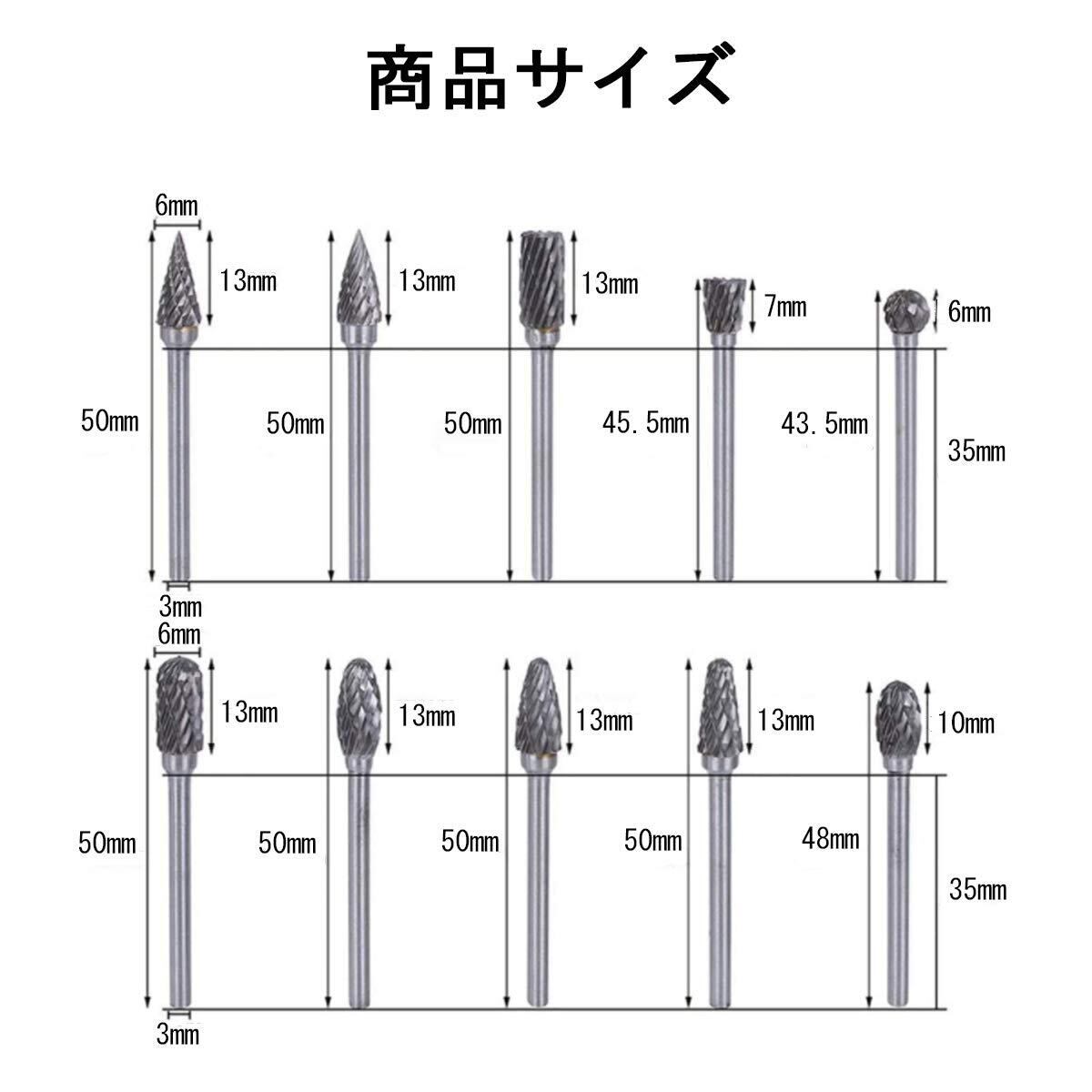 超硬バー リューター ビット 10種類 10本セットタングステン製 リューター ビット 超硬ドリルビット 3mm 軸 刃幅6mm (50mm長)