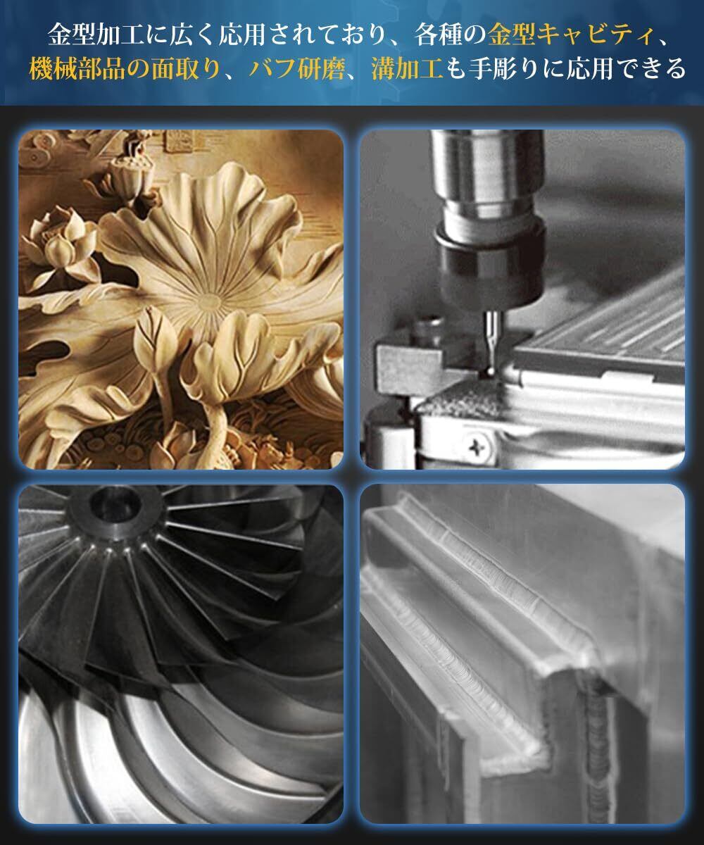 幅広い用途:工芸品、金型キャビティ、金属と非金属、自動車のエンジン工場など切削、 研磨加工。主に木、アルミ、プラスチックなどの軟らかい素材に適用します。自動車やバイクのエンジンポート研磨、溶接目研磨・バリ取り作業などにも最適です。 鉄やステンレス等の研磨に最適です。
