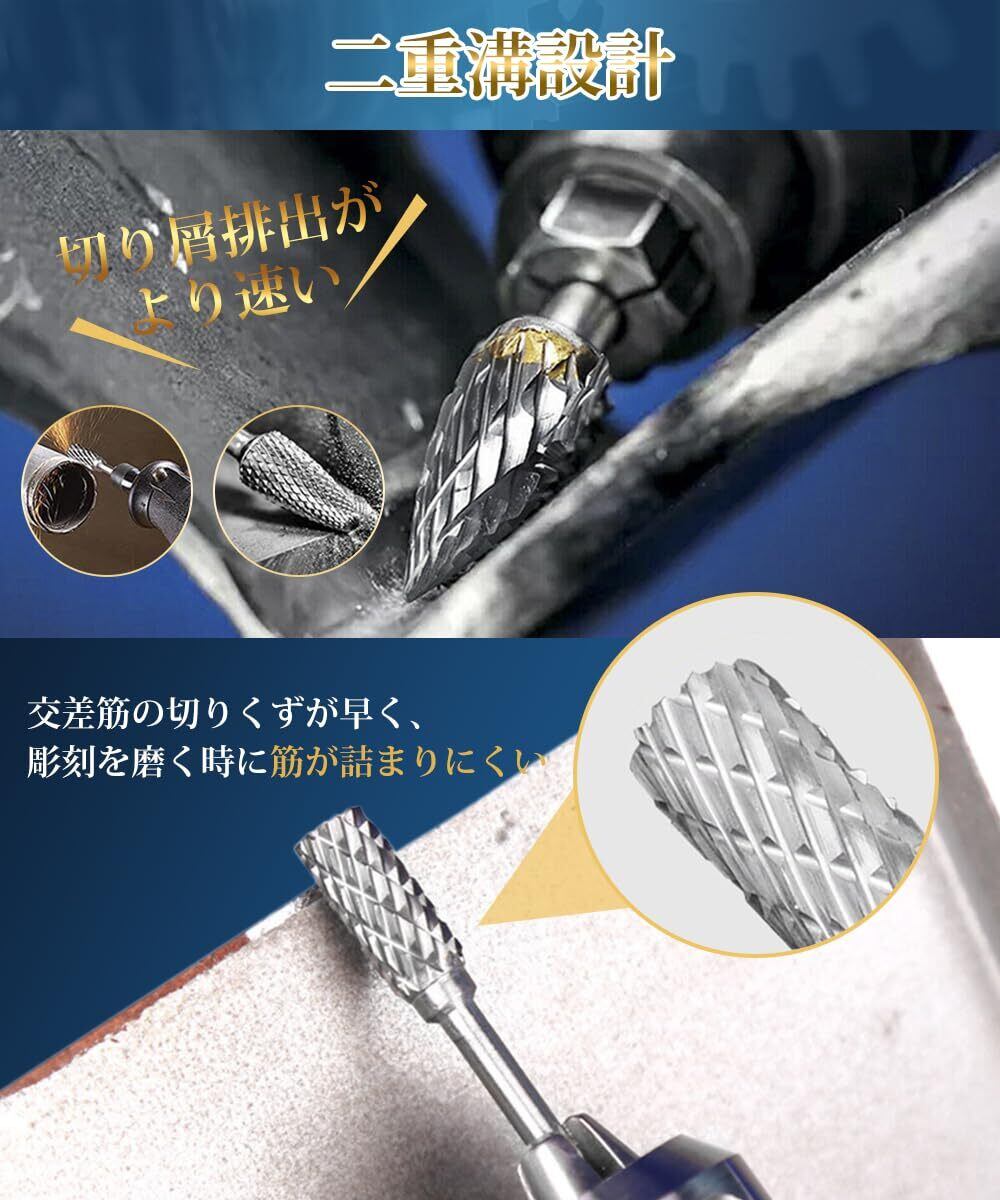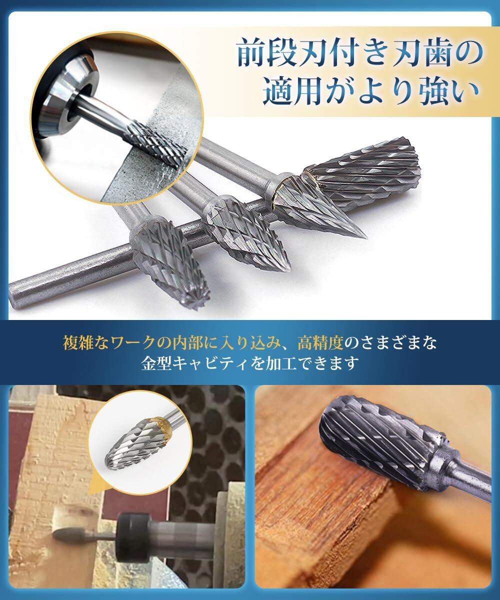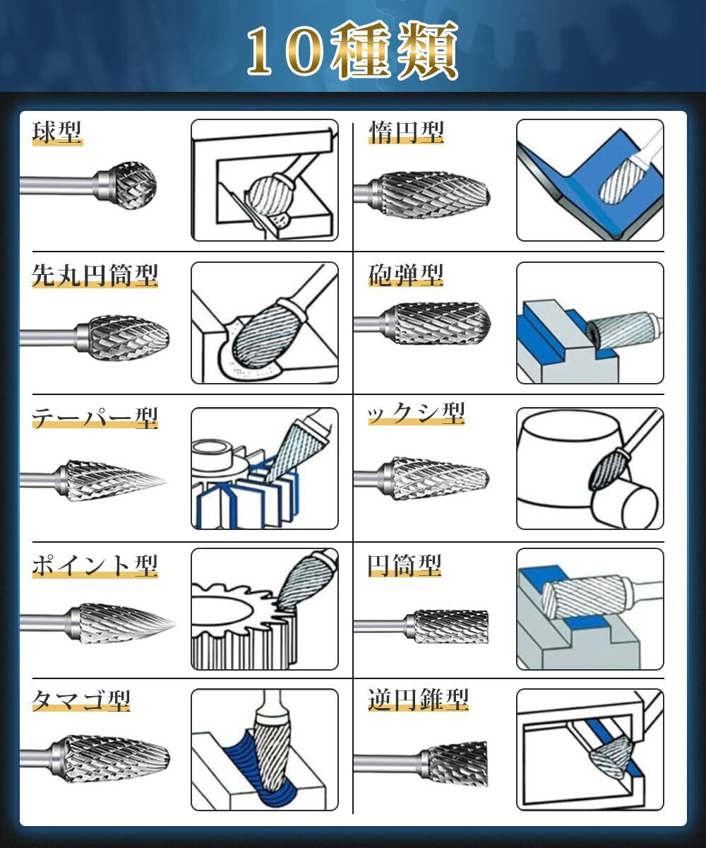 サイズ:全長約40~50mm、シャンク径:3mm、ヘッド直径:6mm、材質:タングステン鋼。10種類:様々なご使用場面に応じて10種類のヘッドをお選びいただきます。