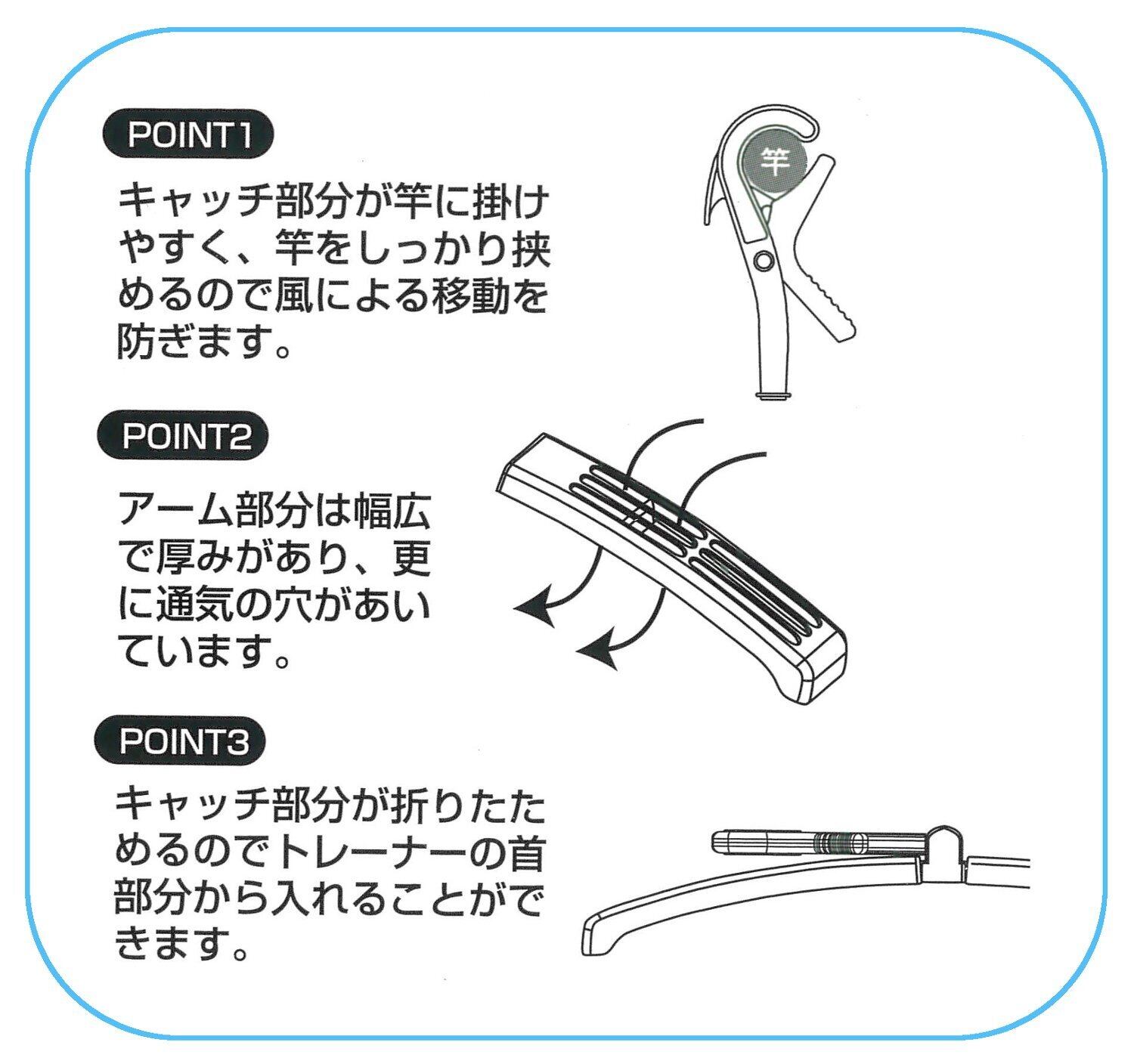 竿に賭ける部分はしっかりしたキャッチ式。風でハンガーが移動したり飛ばされてしまうのを防ぎます。