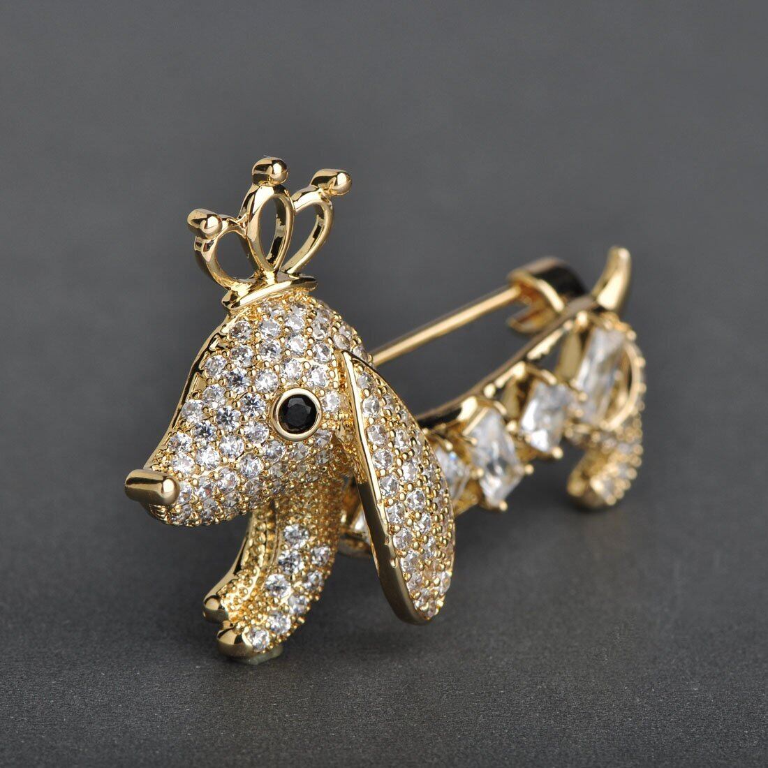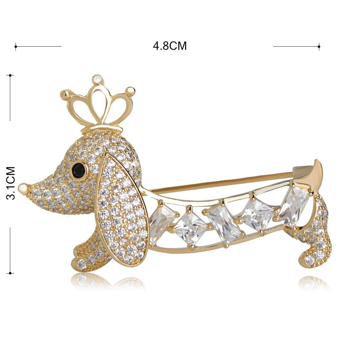 かわいい キラキラ クラウンをかぶる犬のブローチ ピン おしゃれ レデイース メンズ ピンバッジ 人気 コサージュ クリスタル ジルコン 上品 ゴールド 18k 金色 ダックスフント | hananoki