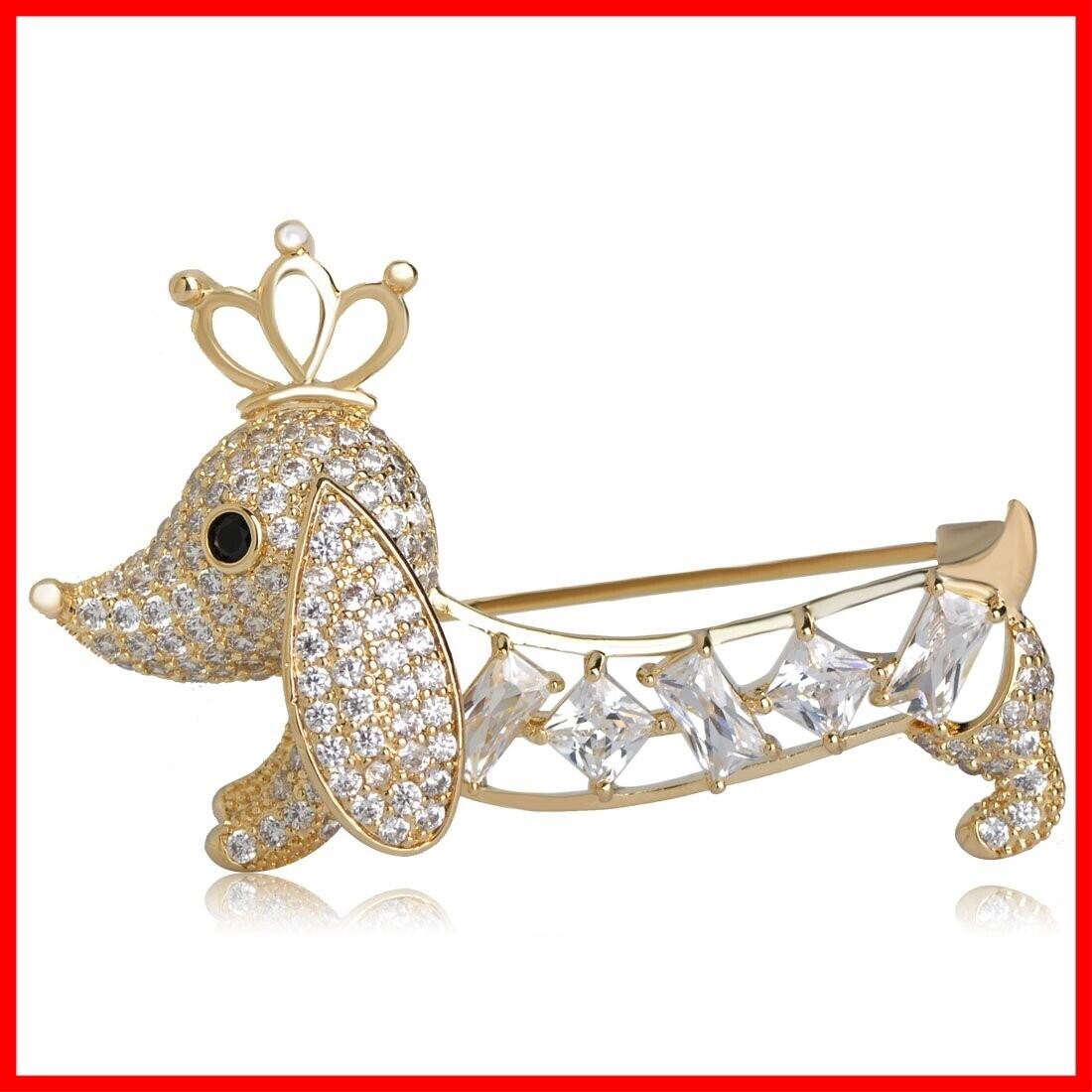 かわいい キラキラ クラウンをかぶる犬のブローチ ピン おしゃれ レデイース メンズ ピンバッジ 人気 コサージュ クリスタル ジルコン 上品 ゴールド 18k 金色 ダックスフント
