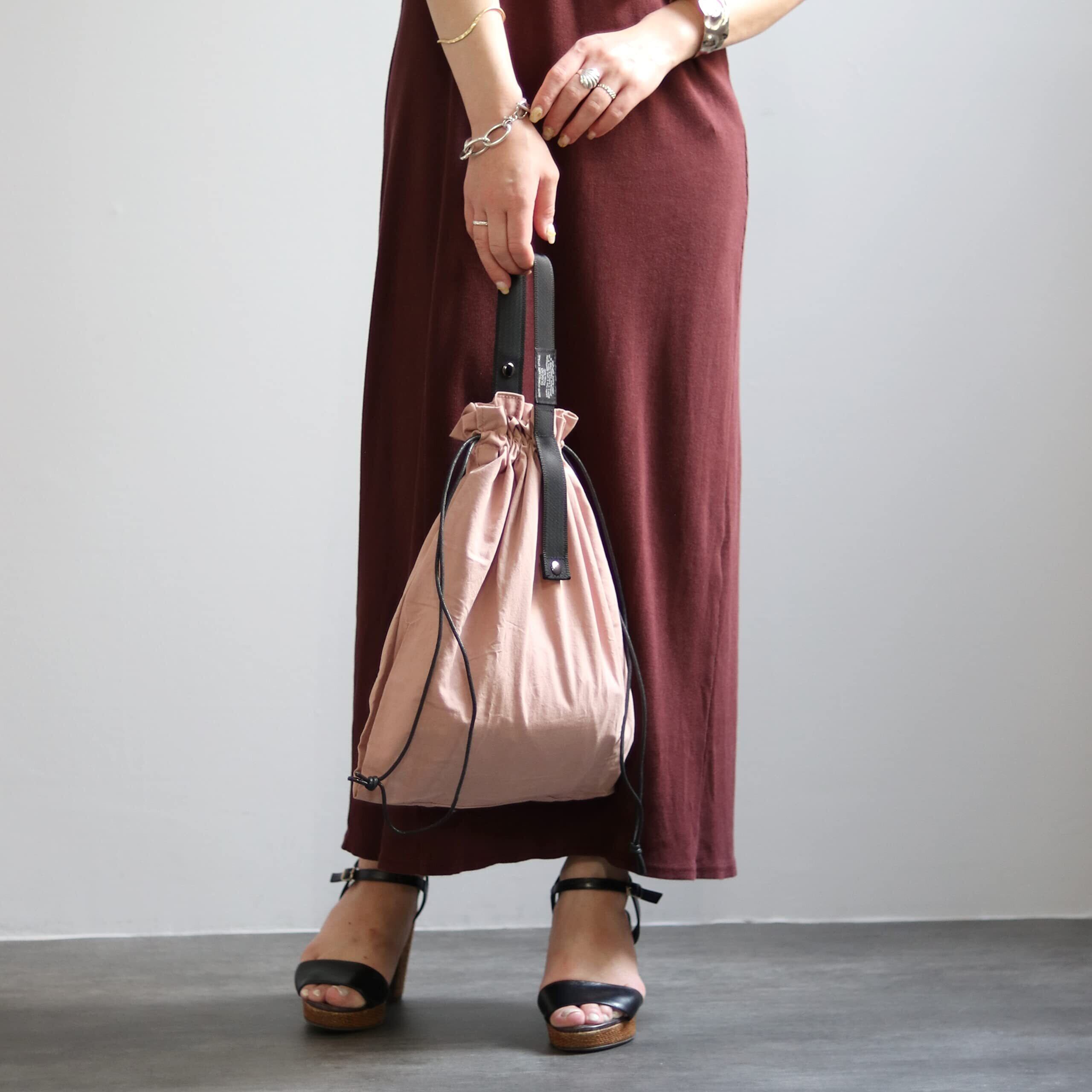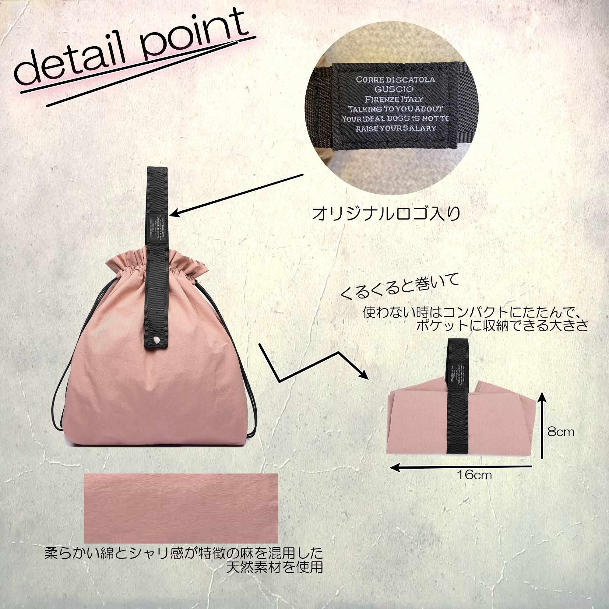 ①綿麻素材を使用し綿の持つ柔らかさと麻のもつ独特のシャリ感が特徴です。 ②色もアースカラーでナチュラルテイストに仕上げました。 ③コンビニやちょっとしたお買い物の時に便利なサイズになっています。④巾着型なのでコンビニ弁当を入れても傾きにくくなっています。 ⑤普段使いしてもかわいいデザインになっています。