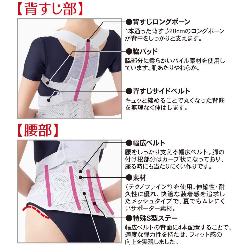 1本通った背すじ28cmのロングボーンが背中をしっかりと支えます。背筋サイドベルトをキュッと締めることで丸くなった背筋を無理なく伸ばし、美しく健康的な姿勢をつくります。