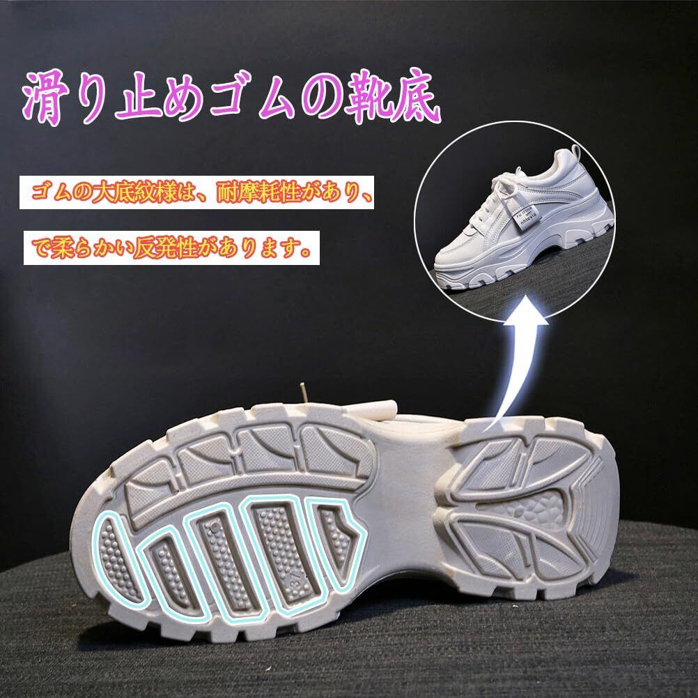 【クッション性、疲れにくい】厚底スニーカーのソール全体はクッション性と耐摩耗性のいいゴムを使用し、ソールが振動を分散したり吸収したりすることができ、地面との反発力を高め、クッション性、耐久性も抜群、履き心地はとてもいいです、歩きやすさ。軽い運動靴は長時間歩いても疲れにくい。