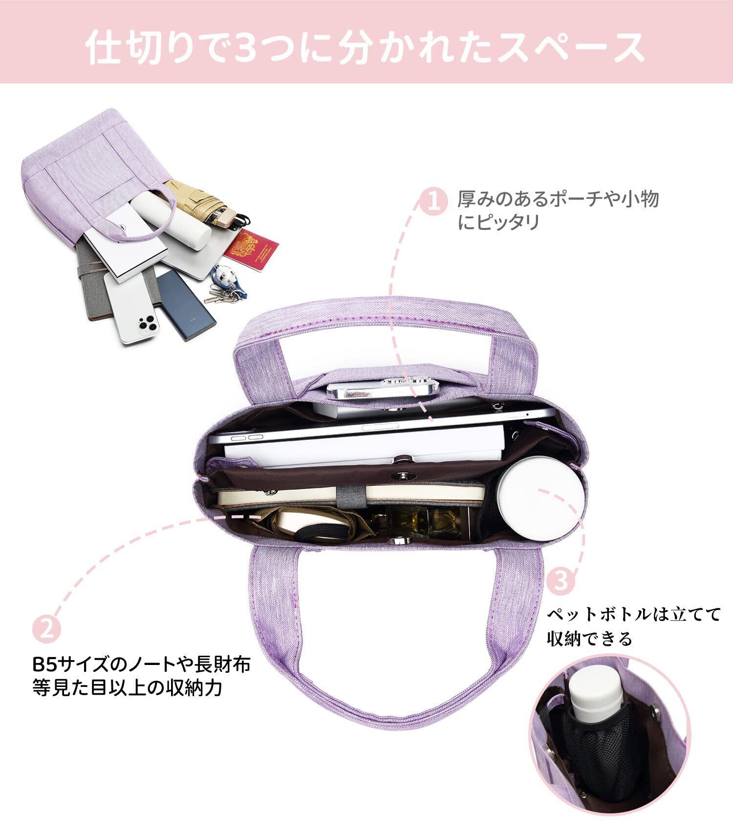 【3仕切りでスッキリ収納】ENLANミニトートバッグには3つの仕切りと4つのポケットがあり、荷物はサッと入れやすく、スッキリかつ楽に収納できます。荷物は綺麗に整理整頓して入れられるミニバッグです。またペットボトルは立てて収納できてより便利に使用できます。普段使いにも、通勤バックにも使えます。