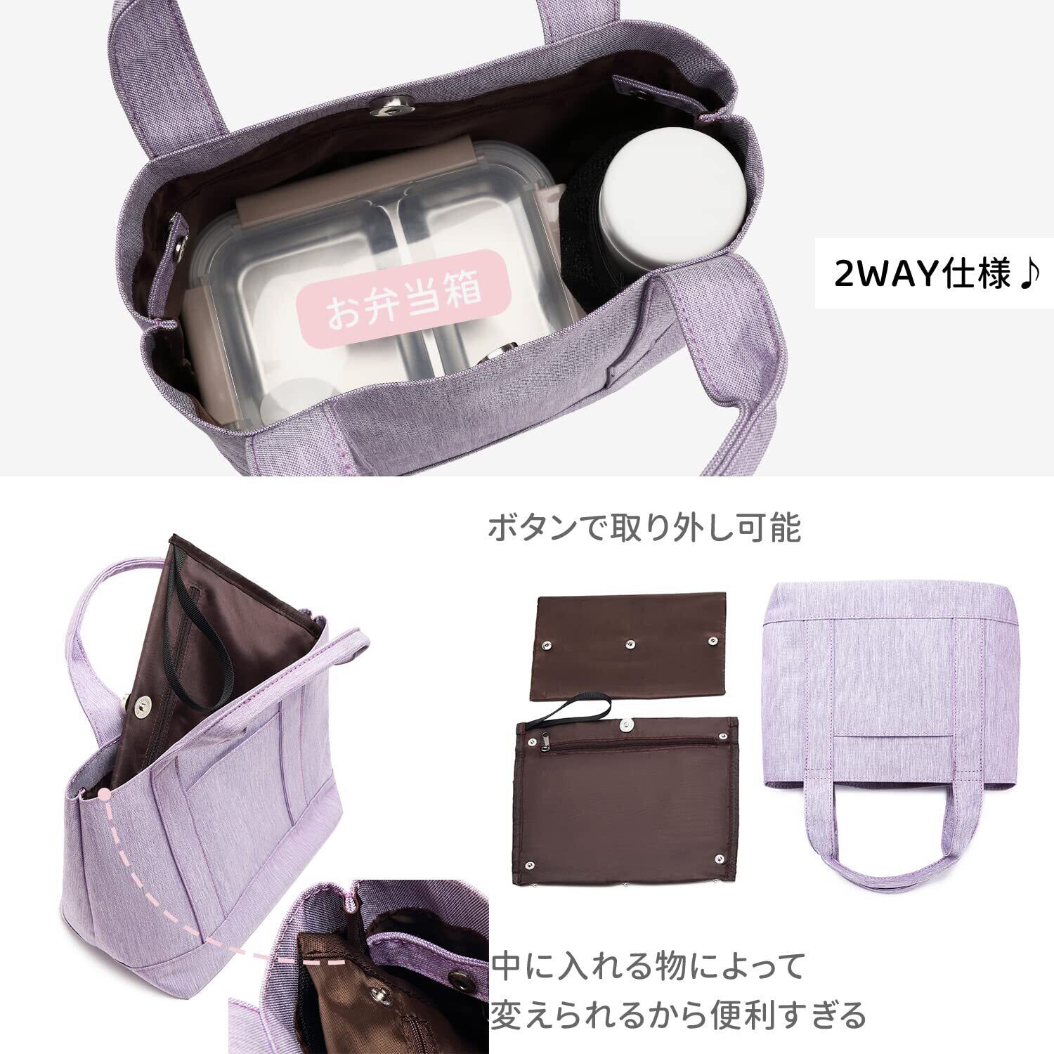【見た目以上の収納力と機能性】コンパクトだけど収納スペースにはペットボトルが立てて収納できたり、長財布はもちろん、B5サイズノートも収納可能なレディース/メンズ トートバッグです。またお弁当箱など、かさばる荷物が多い日は仕切りを取り外して、普通のトートバッグに変身、ランチバッグにもピッタリです。さらに底板付きで多くの荷物を入れても安定して自立します。