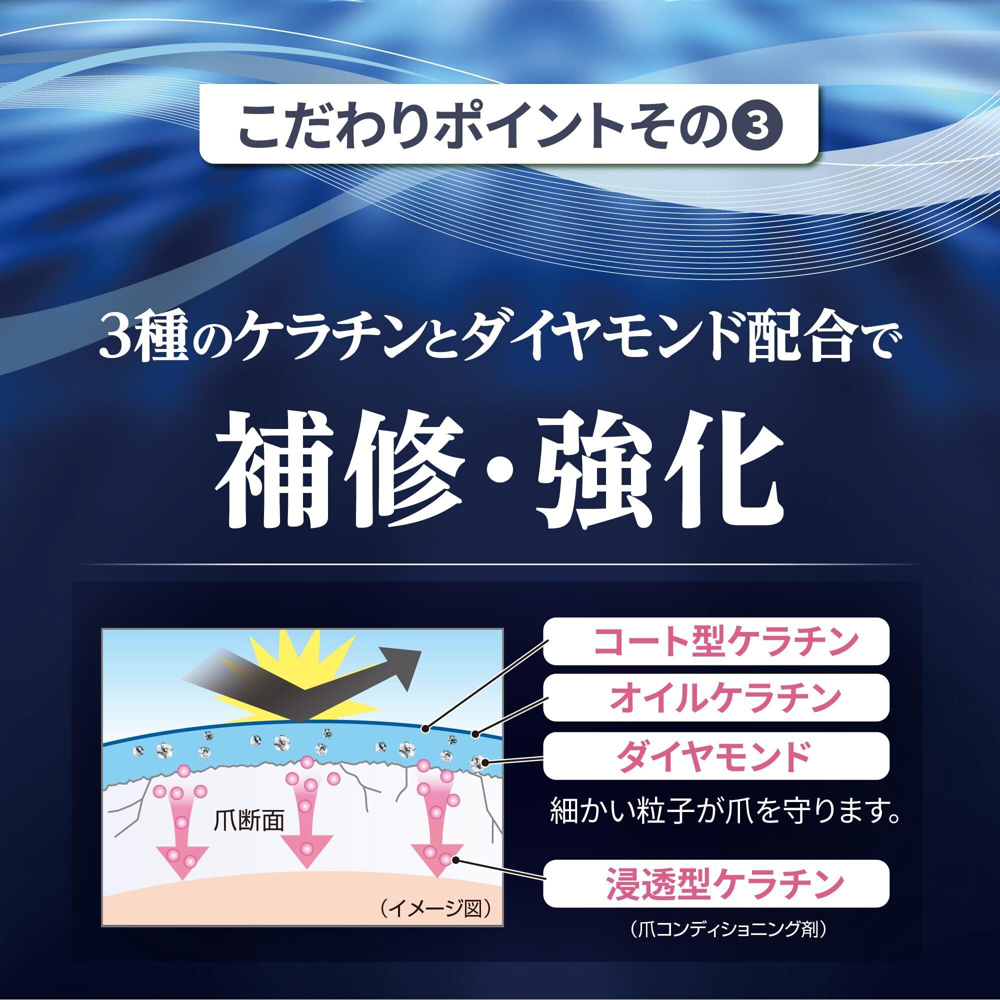 3種のケラチン※1&透明ダイヤモンド※2配合コートで爪を強化&補修。(※1イソステアロイル加水分解ケラチン(羊毛)、加水分解ケラチン(羊毛)、ラウルジモニウムヒドロキシプロピル加水分解ケラチン(羊毛) ※2ダイヤモンド末(全て爪コンディショニング剤))