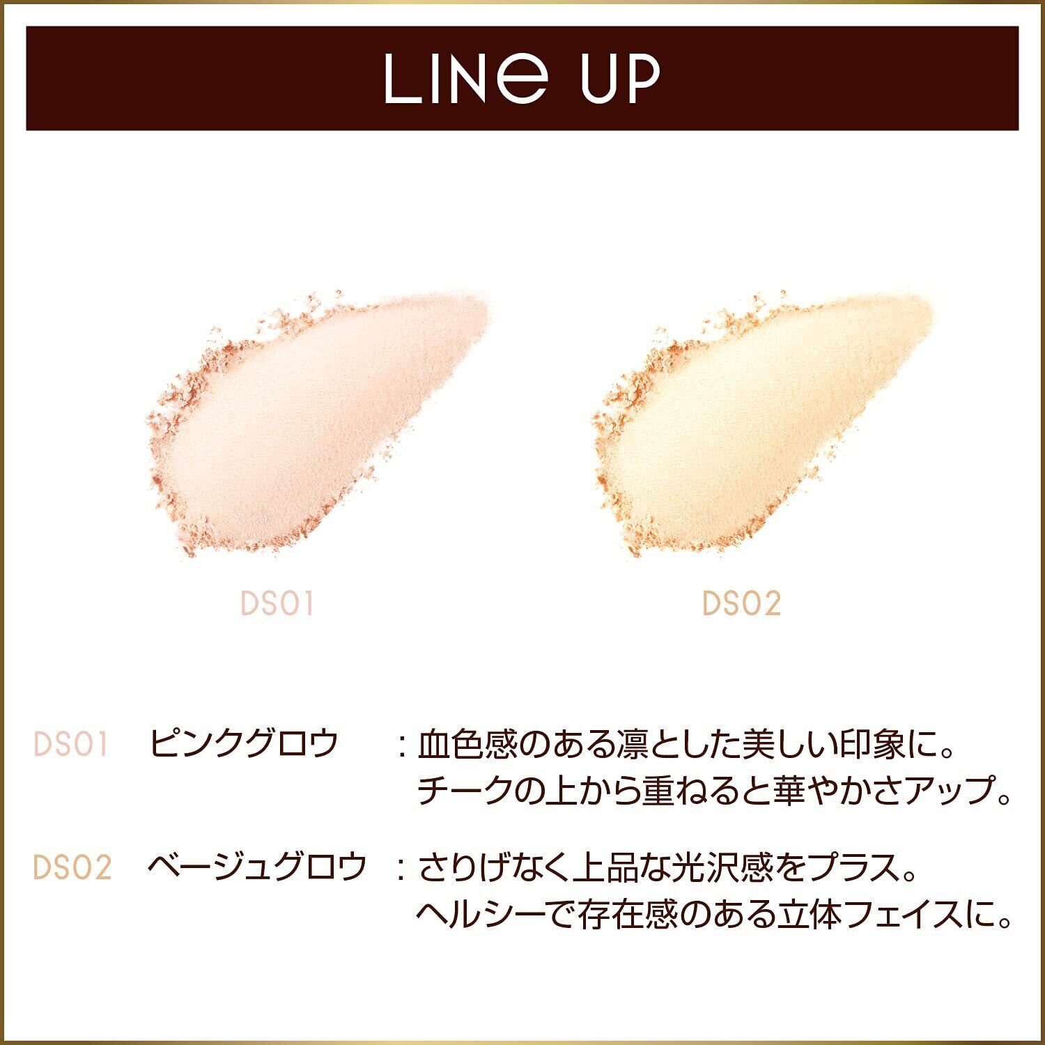 輝き方の異なるパールをMIX配合光を透過するシアーな仕上がりで、肌に自然な奥行きと透明感のあるツヤを演出。つけたての輝きをキープする高密着処方粉とびすることなく肌に溶け込むようにフィット。うるおいを守る美容液成分配合。・DS01 ピンクグロウ:血色感のある凛とした美しい印象に。チークの上から重ねると華やかさアップ。・DS02 ベージュグロウ:さりげなく上品な光沢感をプラス。ヘルシーで存在感のある立体フェイスに。