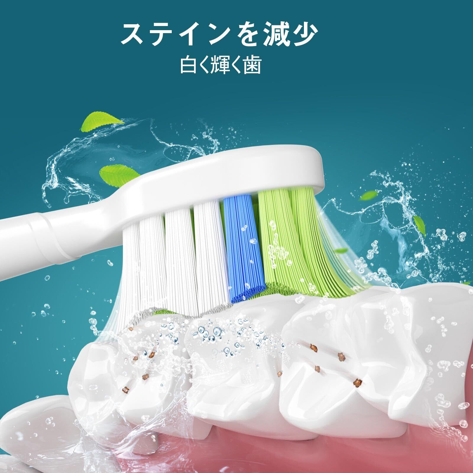 【手動歯ブラシより8倍の歯垢除去】ブラッシング接触面積を最大化にして、密集した毛先のステイン除去パッドが、表面の8倍の歯垢を簡単に取り除きるだけなく、波状な毛先デザインで、歯に完璧にフィットし、歯間部にも届きやすく、効果的に歯間の歯垢除去ができます。