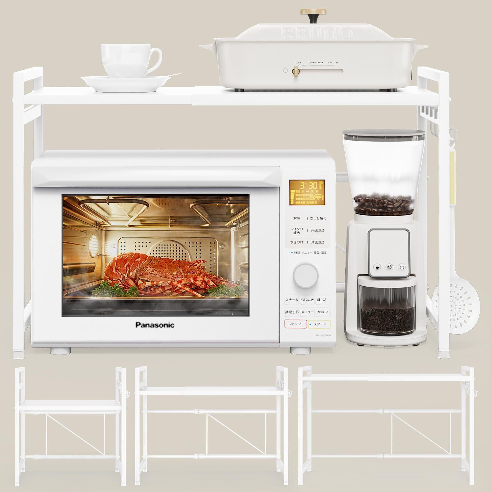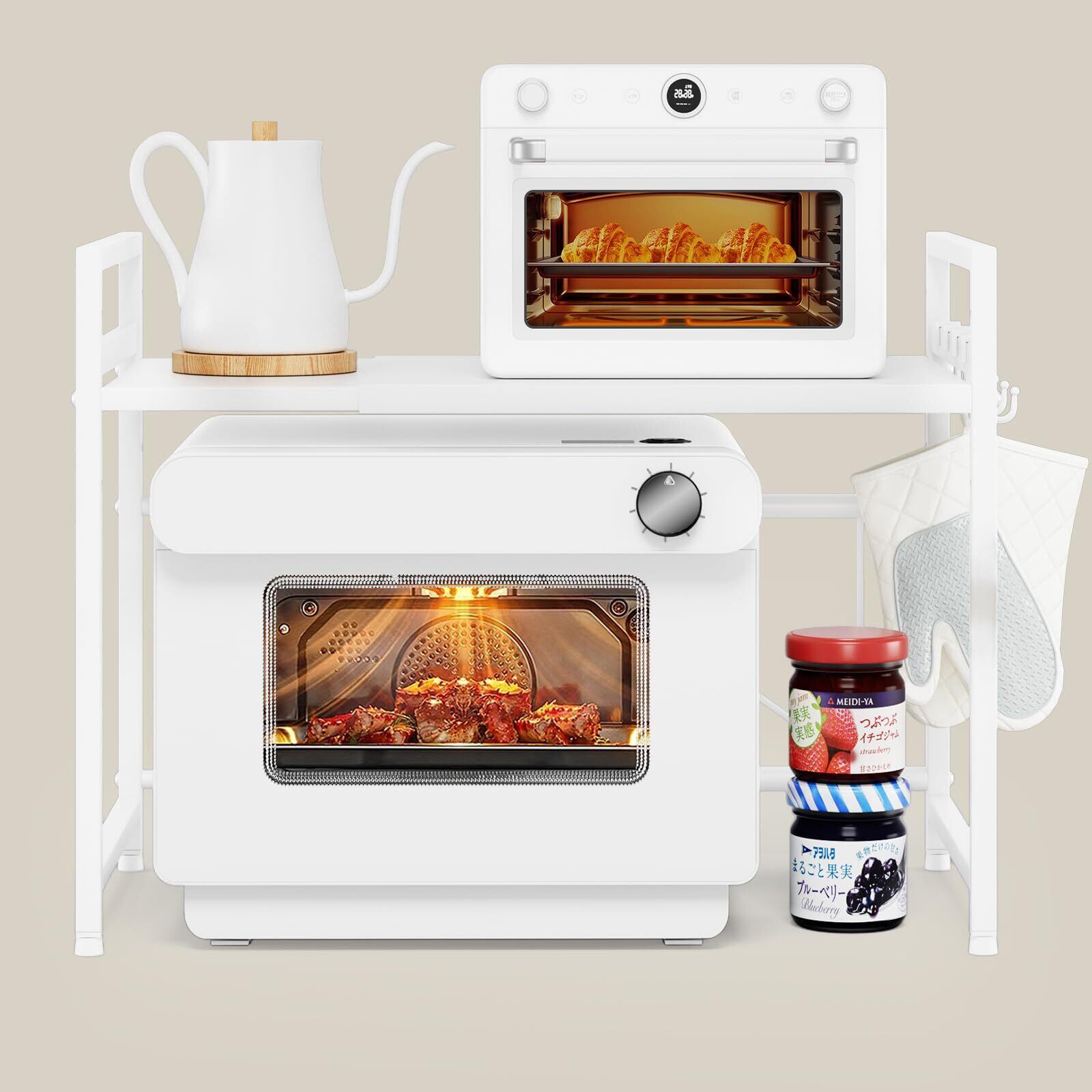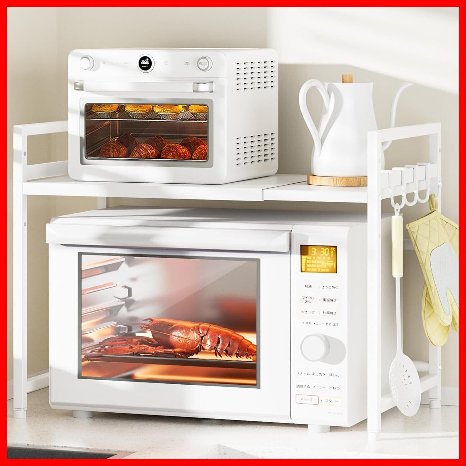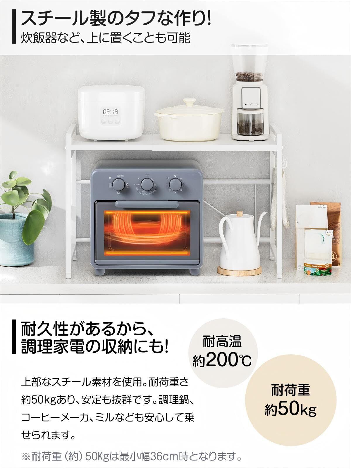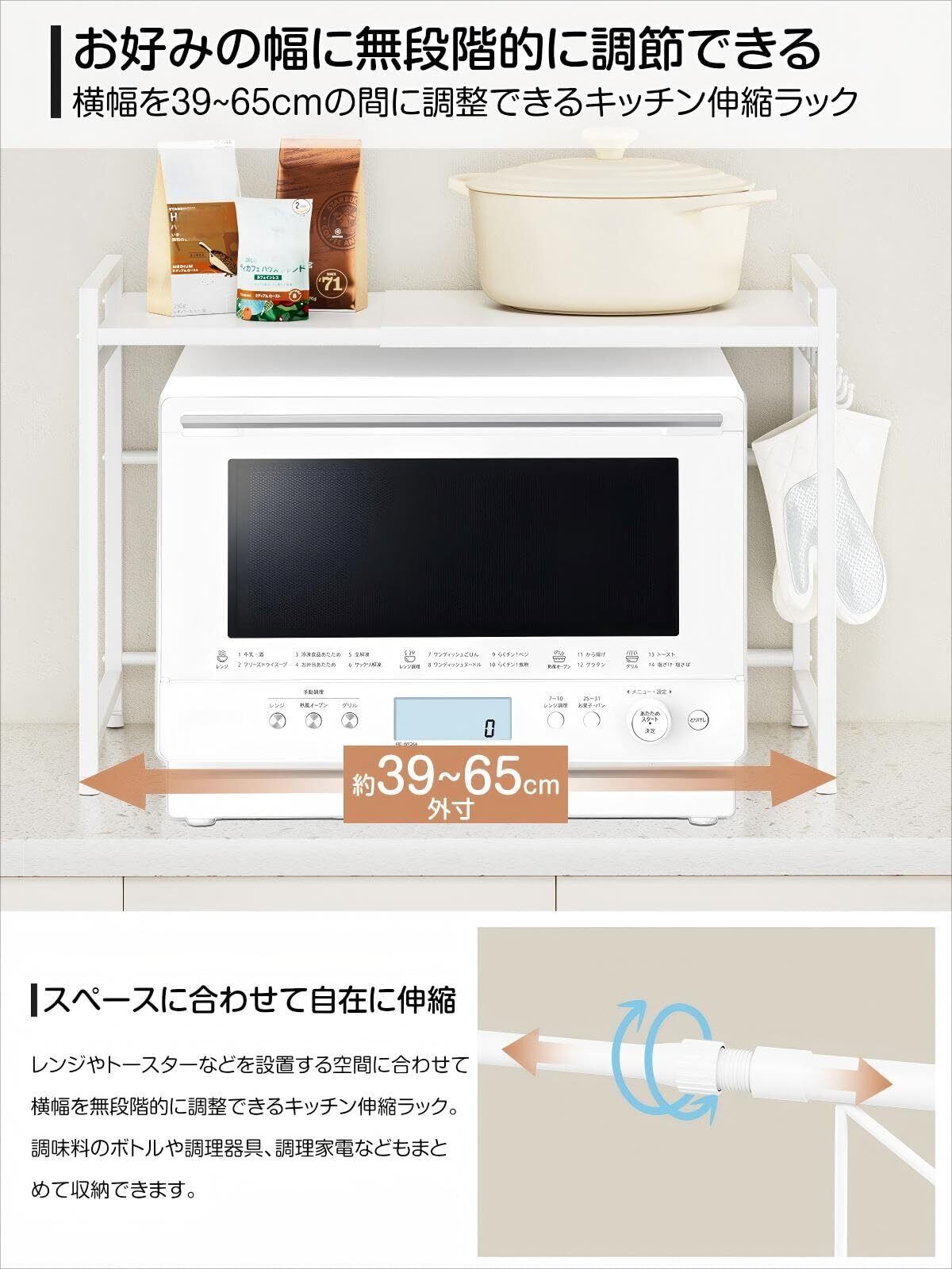 レンジ上ラック トースターラック レンジラック 伸縮式 幅(36~65cm) 棚板高さ調節可 耐荷重50kg シンク上キッチン収納ラック フック4個付き (ホワイト)