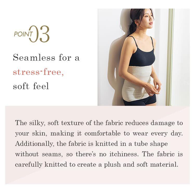 【天然の美容成分シルク】シルクがもつタンパク質「セリシン」は人の肌構成とそっくり。共通した18種類のアミノ酸で構成されているので、肌なじみの良さにうっとりします。シルクの繊維には小さな穴が無数にあります。空気を多く含む事ができるので、体温を逃がしづらく一定の温度を保ってくれます。また、コットンの役1.5倍の吸湿性があるため、汗を素早く吸収し、湿気を逃がす力もあるので、オールシーズン快適な着心地を実現してくれます。ミッシーリストの「シルク腹巻」は、筒状に編まれているので縫い目がありません。嫌なチクチク感がなく、ストレスフリーに着用できます。低刺激なので敏感肌の方にもおすすめ。