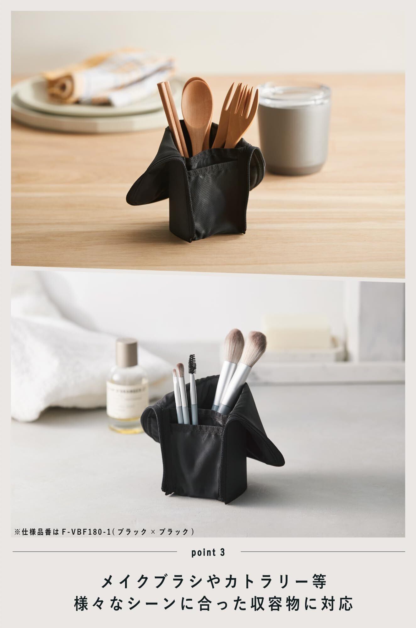 【POINT3:メイクブラシやカトラリー収容等、様々なシーンに合った使い方が可能。】小さなスペースにも立てて置けるため、外出先でも便利。