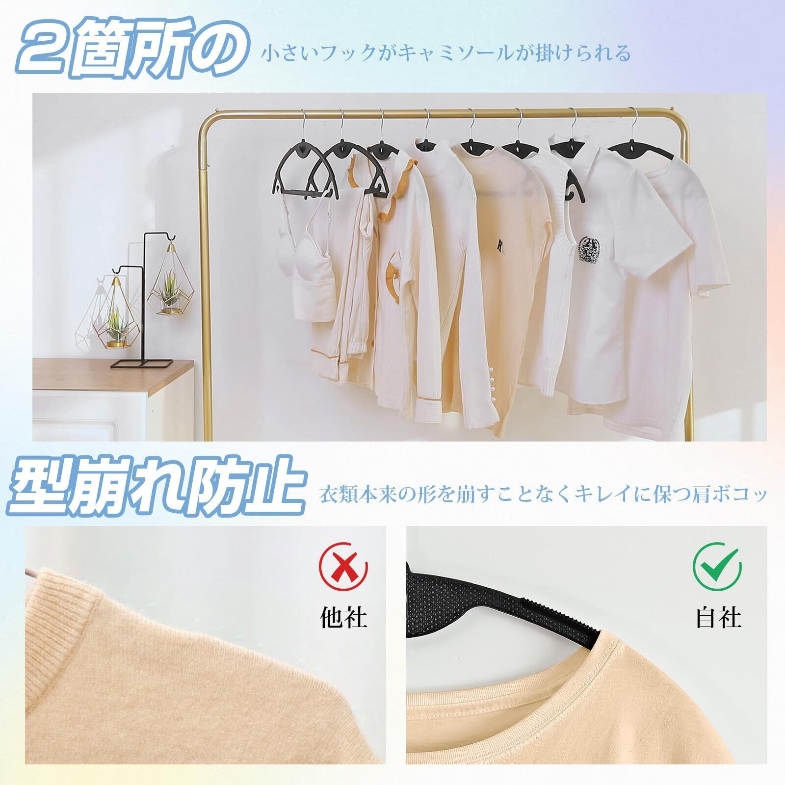 【すべらないハンガー&多機能】ハンガーの肩部分と下側は3か所に滑り止めの材質が付いていて、衣類をしっかりキップできる滑らないハンガーです!Tシャツ、セーター、コート、スカート、洋服はもちろん、ズボン、タオル、マフラーでも大丈夫です。ハンガーの下に小さいフックが、キャミソールも掛けられます。