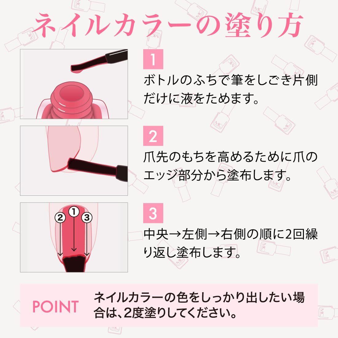 【 ベースコート トップコート 配合 】 ベースコートとトップコート、両方の効果が備わっているので、ひと塗りできれいな仕上がりに。 乾きが早く、持ちが良いのでネイルカラーを塗り慣れていない方にもおすすめしています。