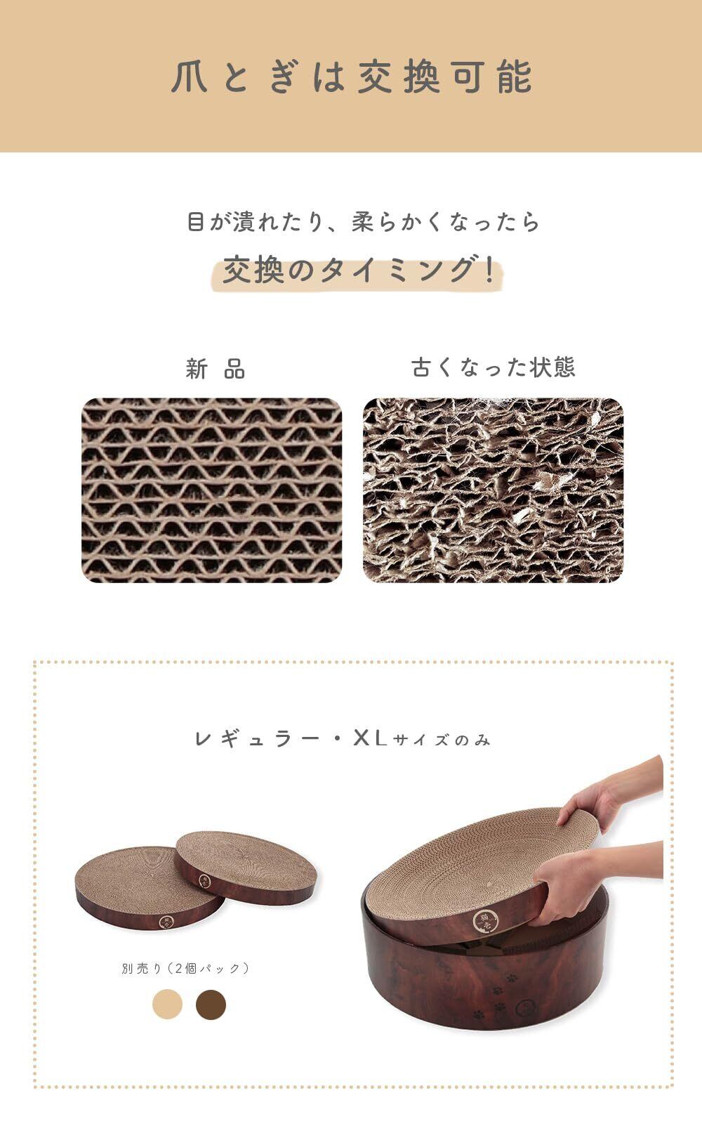 【XLサイズもつめとぎ部分は交換可能】バリバリボウルの特徴であるつめとぎ部分のみの交換、XLでも可能です。 交換用つめとぎとして販売しています(別売り)。 猫のつめとぎは消耗品だからこそ、長く使っていいただけるよう、工夫しています。