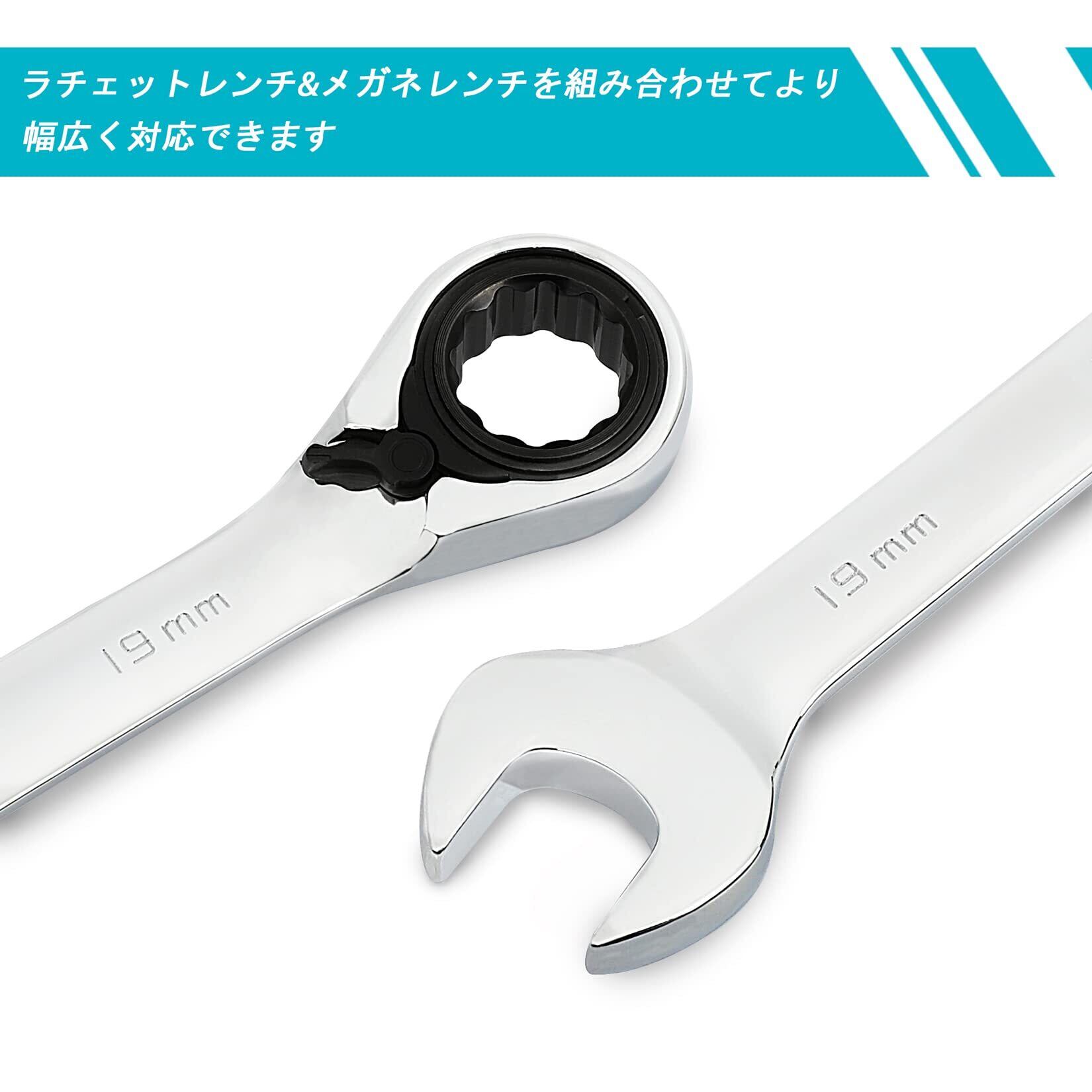 【セット内容】 ラチェットコンビネーションレンチセットには8mm、10mm、11mm、12mm、13mm、14mm、15mm、17mm、19mm各1点 、収納袋1点。
