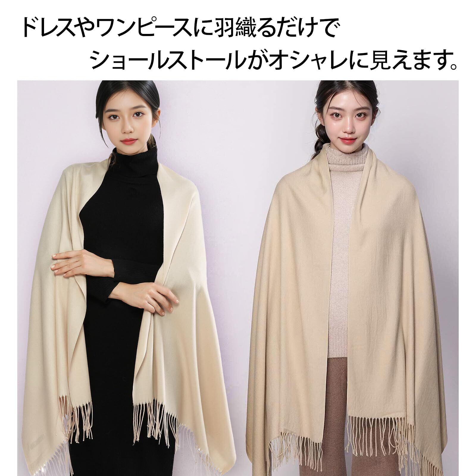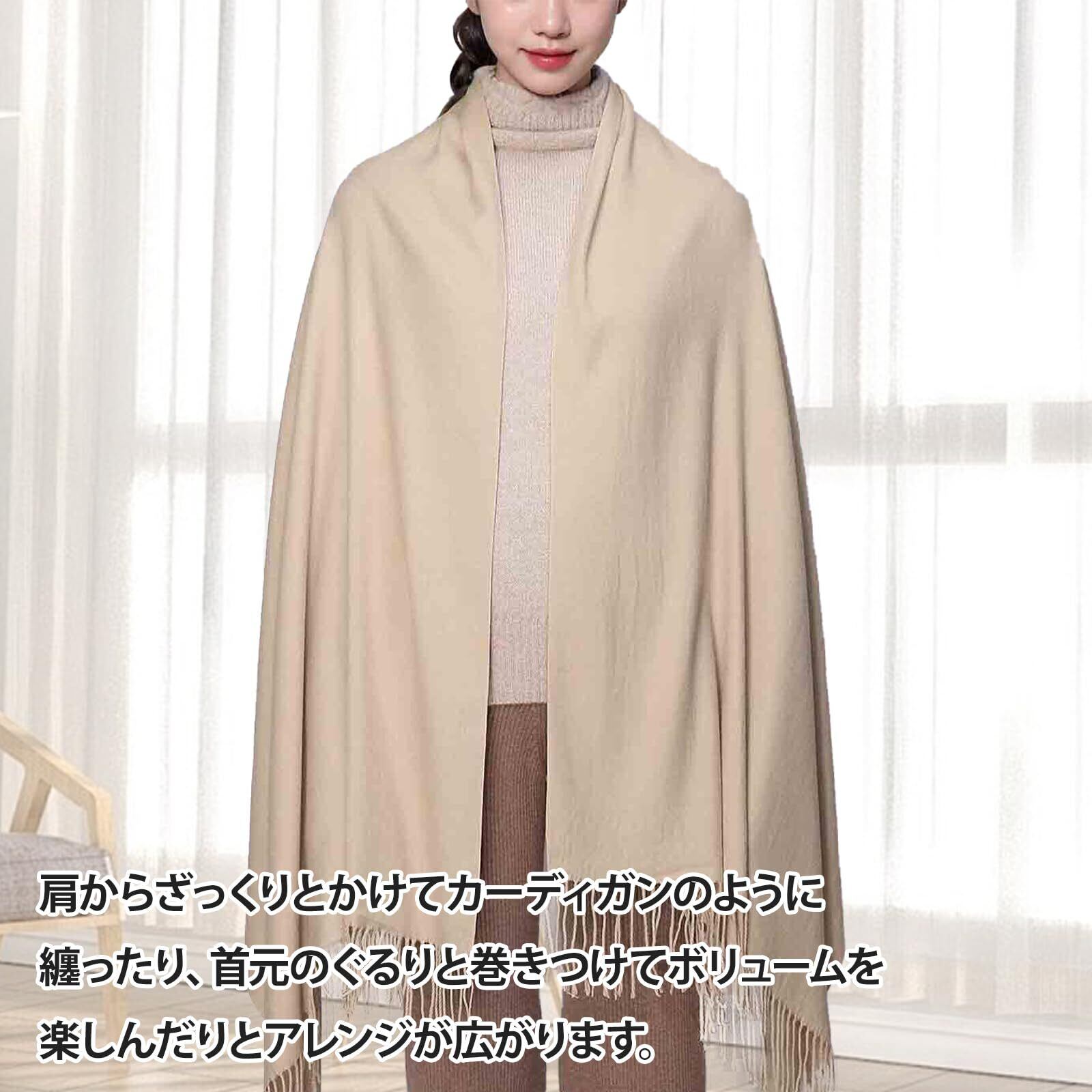 巻アレンジはもちろん、羽織りにも膝掛けにも使える。カシミヤタッチなので、ウールが苦手な方にもオスス