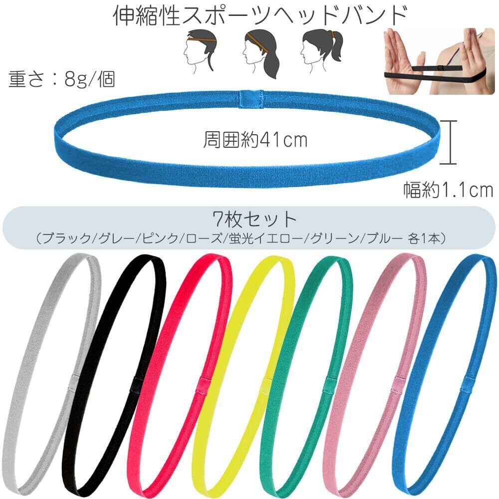 セット内容:伸縮性スポーツヘッドバンド7個セット(ブラック/グレー/ピンク/ローズ/蛍光イエロー/グリーン/ブルー 各1本)サイズ:幅約1.1cm、周囲約41cm 重さ:8g/個 商品素材:ポリエステル 適用:男女兼用