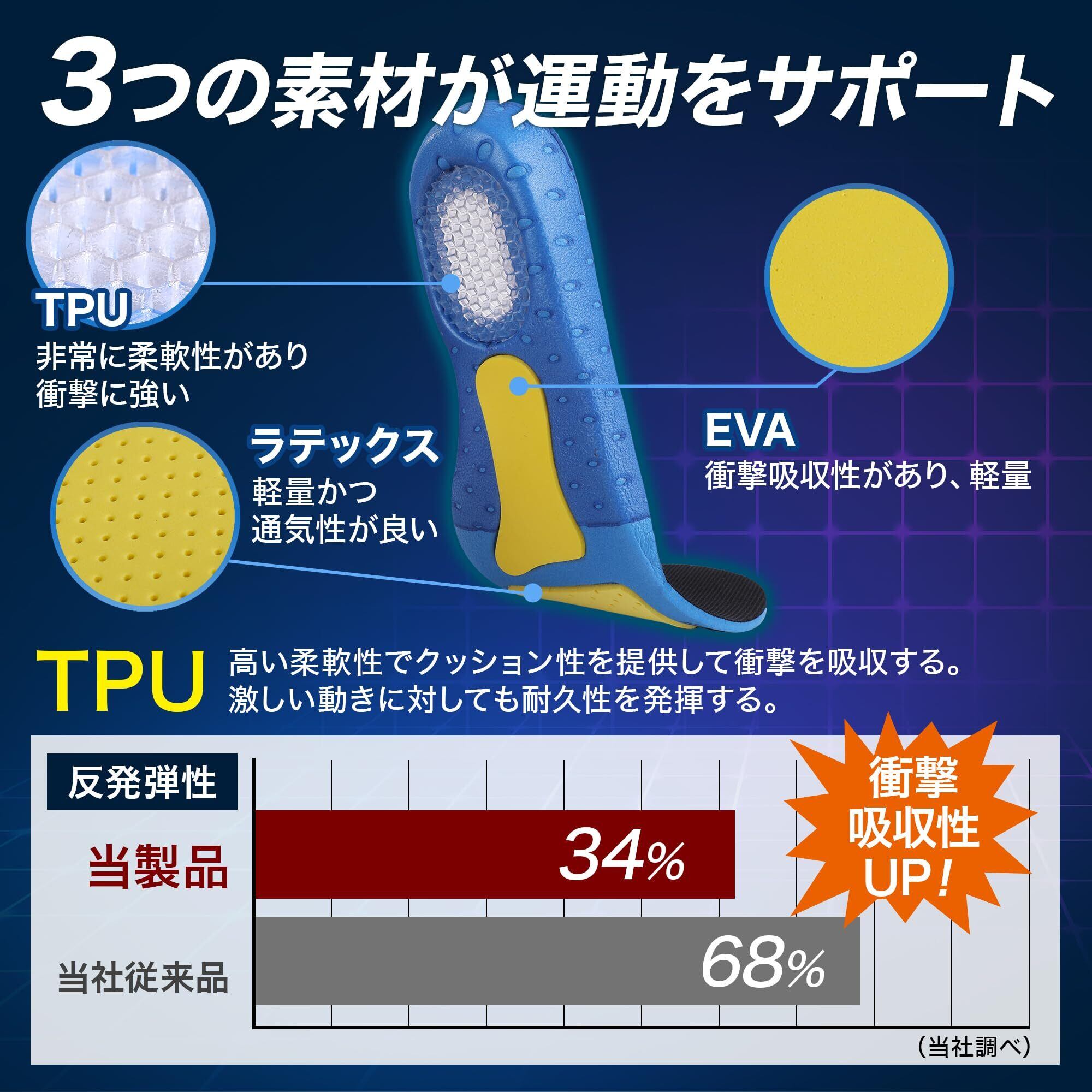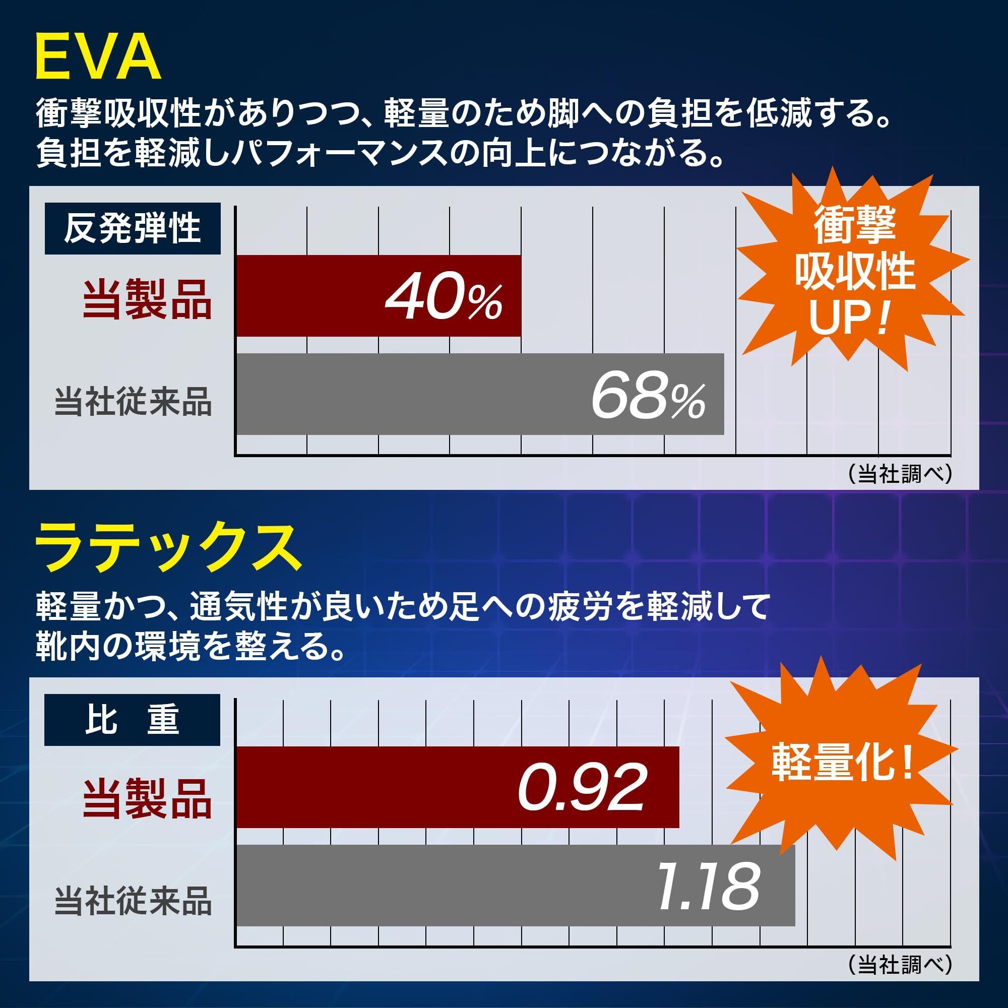【3つの素材で衝撃を吸収】足裏前面のラテックスはクッション性がある素材。滑り止めに効果も。足裏中央のEVAは、弾力性がありやわらかく衝撃に強い素材。かかと部分のTPUは弾力性が非常に強く衝撃に強い素材。3つの素材で足裏への衝撃をしっかりと吸収します。通気性抜群でムレずに快適。