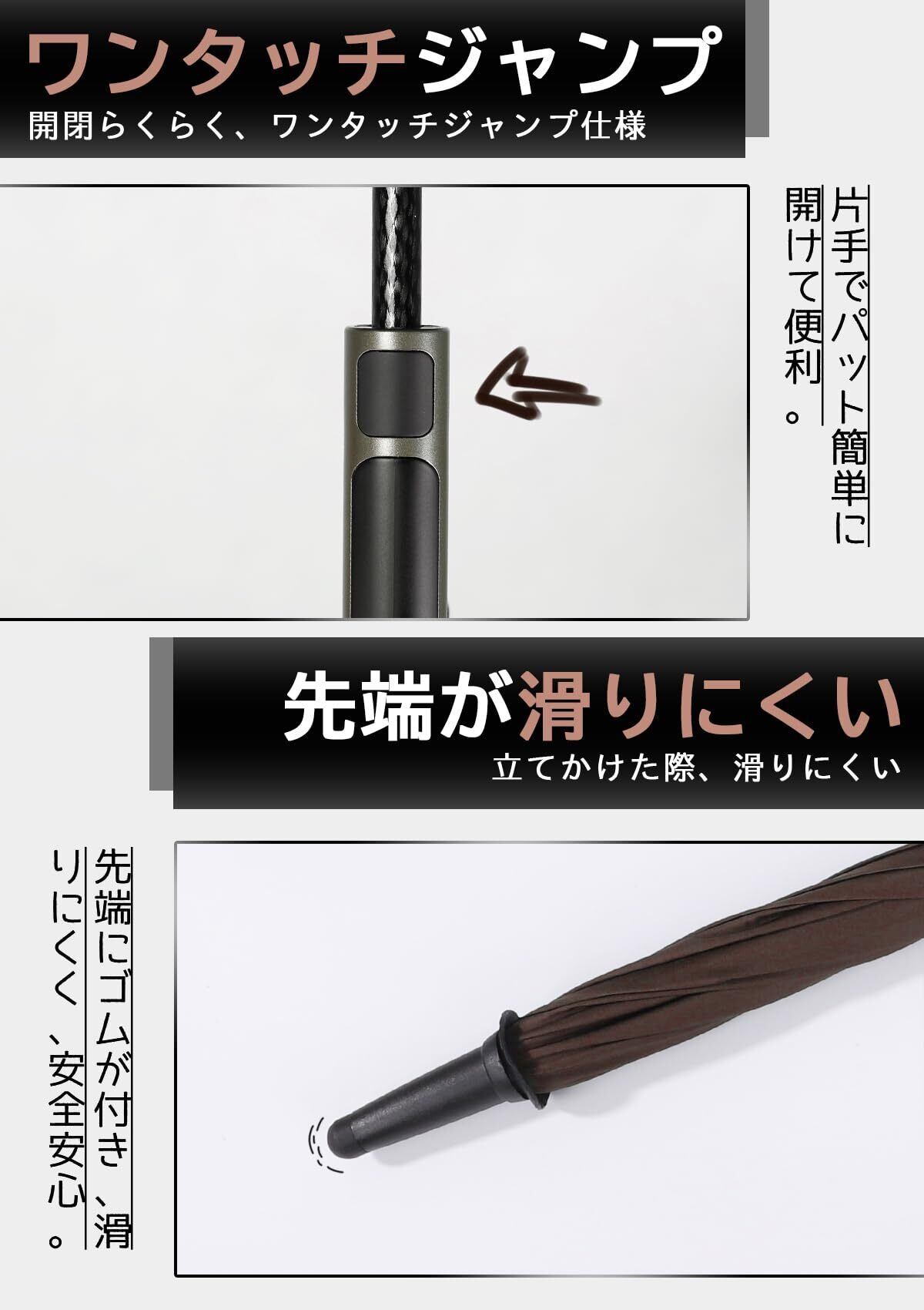 【高級感と紳士感ハンドル&先端】①人間工学に基づいた長いハンドル:ABS素材を使用、ペンキを落とさず、より快適な手触り、便利と掛けやすいです。②傘先の石突部分はゴム加工材でできており、安全に使用できます。ねじ込み式で、リサイクルが可能で環境にやさしい製品です。