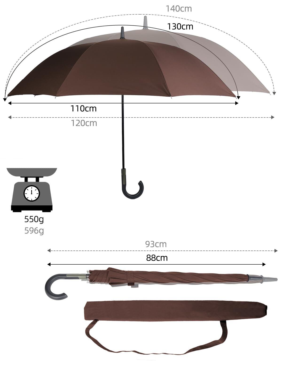 【大判サイズの紳士長傘】:全長:(約)93cm、弧長(約)140cm、直径(約)120cm 三人でも余裕で使える長傘です 。大きいサイズで肩が濡れる 心配もありません。雨を防げる範囲が大きくので、二人で荷物を持って傘に入っても余裕があるほどの大きさです。梅雨はもちろん、豪雨、強風にも安心できます。