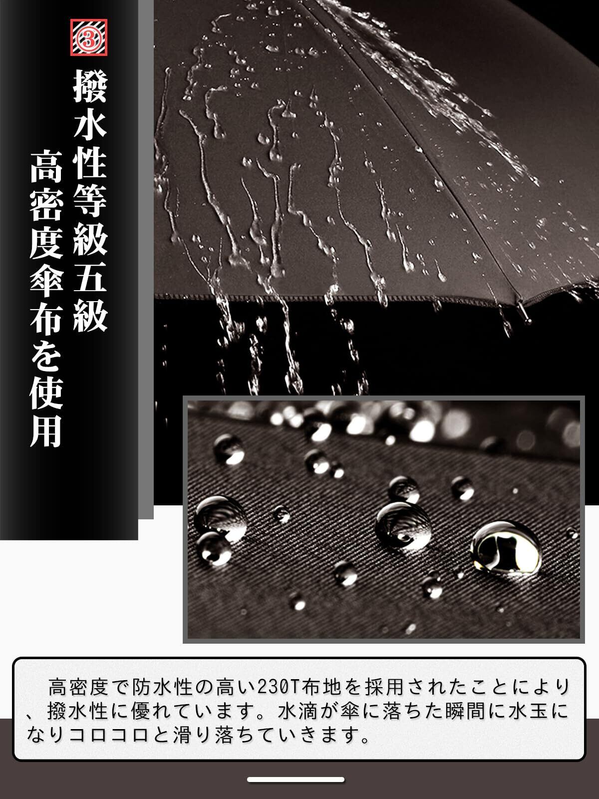 【多層防御・230T高密度NC布】:生地には230Tの高密度NC布でできており、耐水度は通常の傘の2倍以上です。超防水のため、軽く振ると水滴が落ちてくる。もちろん、防汚効果もあります。丈夫な中棒と大面積の傘布は大雨や台風に耐えることができ、傘布のひび割れを心配する必要はありません。また、強い日差しの下では遮光性99%があるため、雨の日だけでなく、暑い季節に通勤用の日よけの傘としても使用できます。