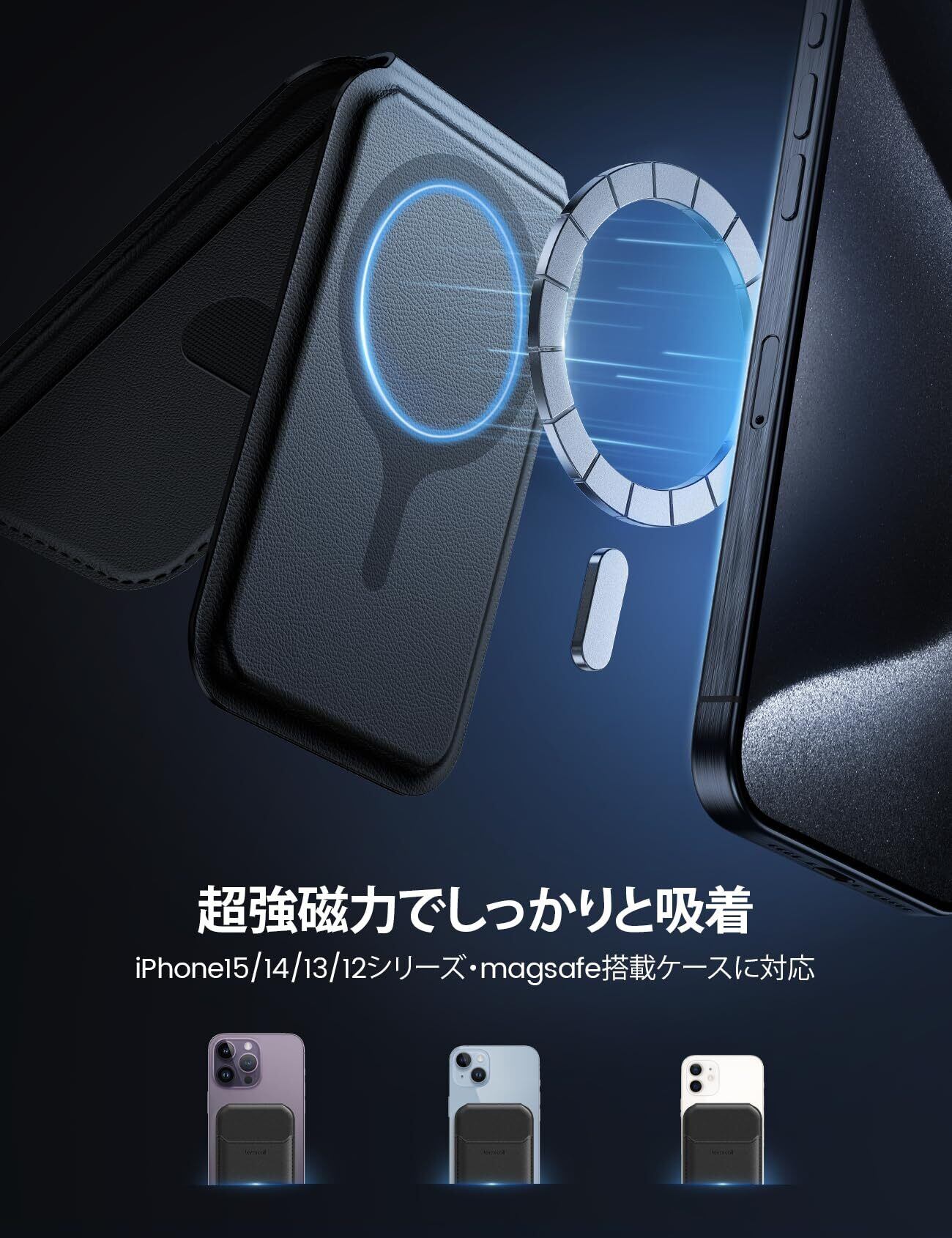 【対応機種】このMagsafeカードケースはiPhone12/13/14/15/16シリーズだけ(Magsafe機能搭載のスマホ)に対応できます。精巧なデザインで、スマホのMagSafe部とぴったりして、カメラを干渉しません。ご注意:カードケースはiPhone 13 mini/12 minよりちょっと長いです。