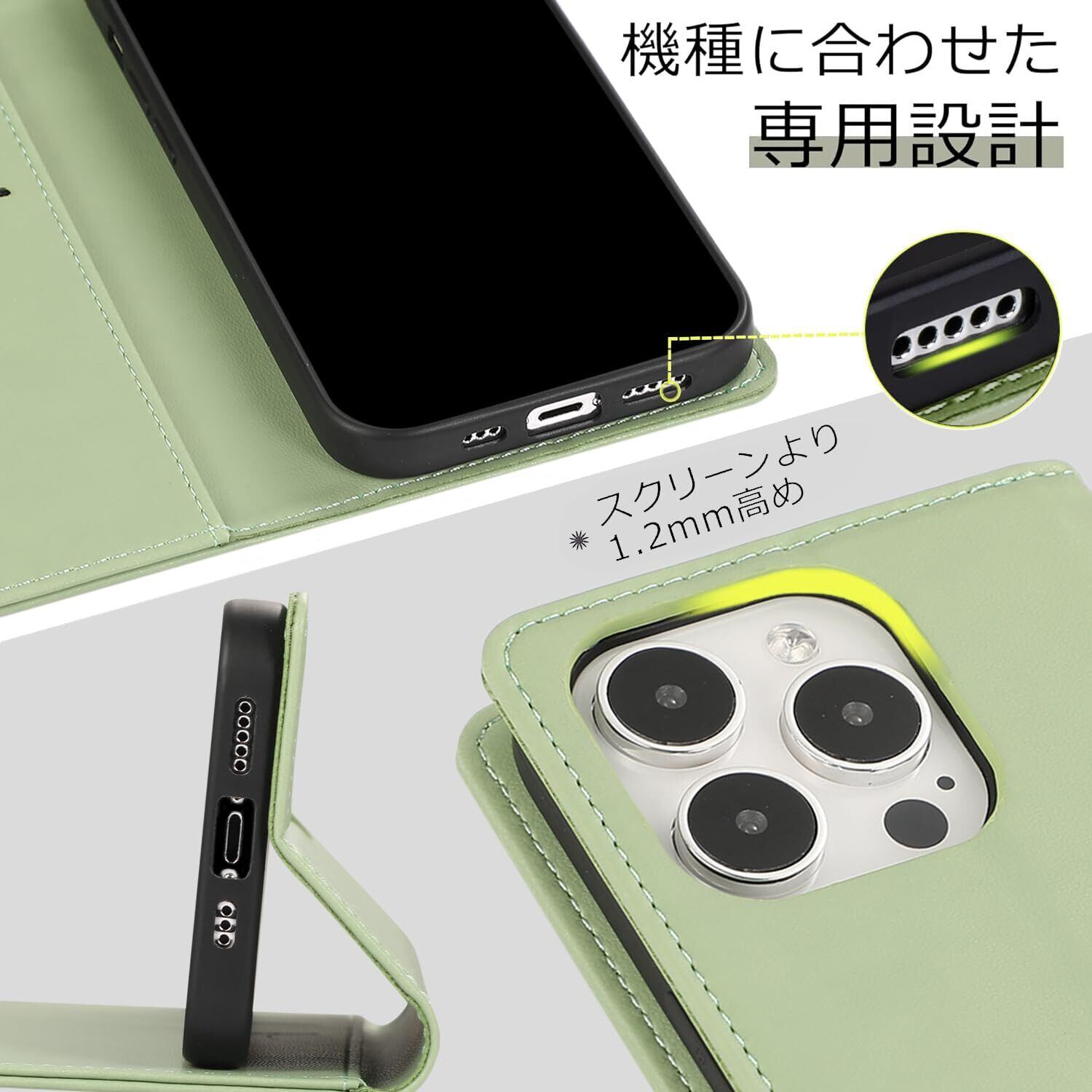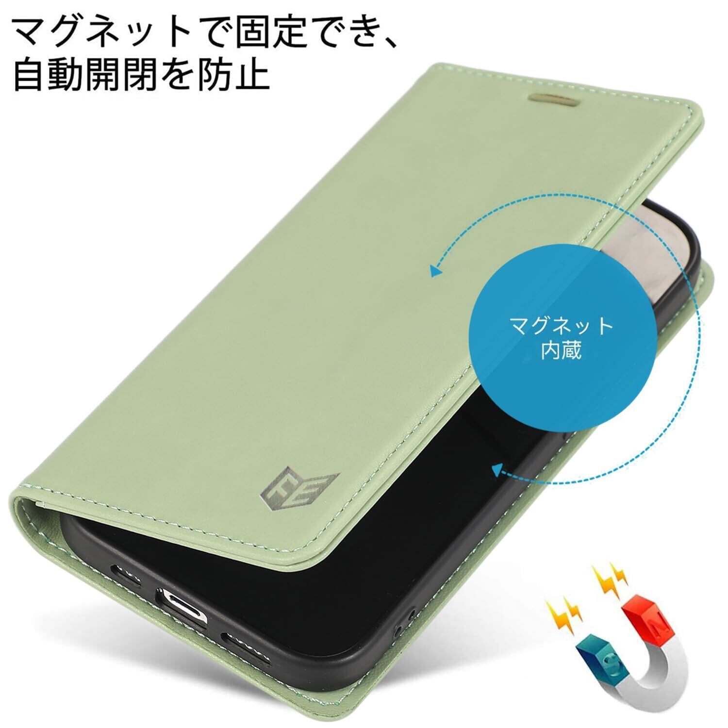 iphone15ケース 手帳型 Iphone15手帳 ケース 耐衝撃TPU素材カード収納 マグネット内蔵スタンド機能付き アイフォン15携帯カバー全面保護 iPhone 15スマホケース 5G 6.1インチ対応, ライトグリーン