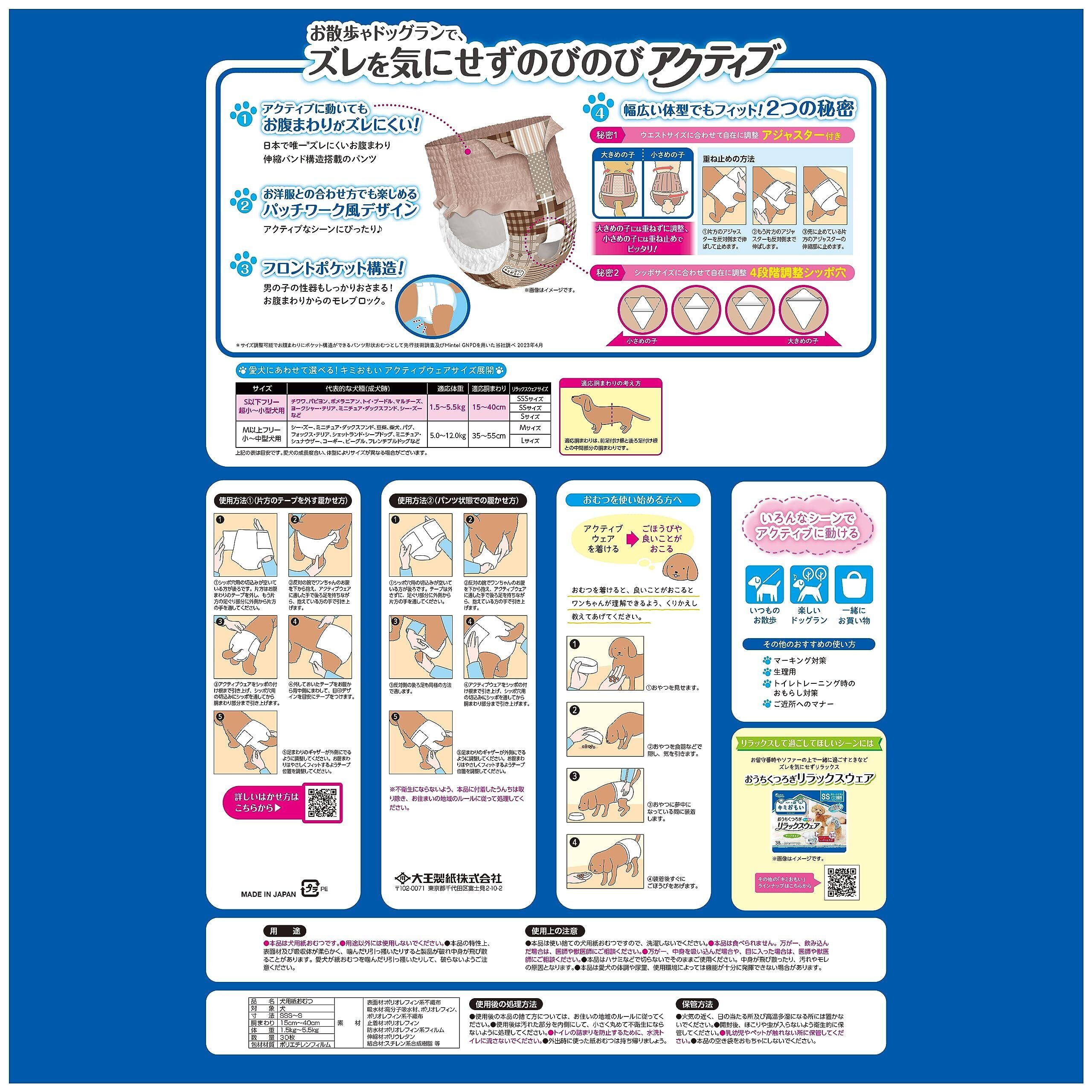 お外向けパンツタイプの犬用紙おむつ。お散歩やドッグランで、ズレを気にせずのびのびアクティブ。●伸縮バンド構造でずれにくい、パンツタイプ。おなか周りの伸縮バンド構造でずれにくい。足まわりフィット構造で動きやすい。●サイズ調整が自在、幅広い体形にフィット。お腹まわりアジャスターで大きめの子は重ねずに調整、小さめの子は重ね止めでぴったり。ミシン目付きの4段階調整しっぽ穴で、ワンちゃんのしっぽサイズにあわせて自在に調整。【使用シーン】・いつものお散歩・一緒にお買い物・楽しいドッグラン