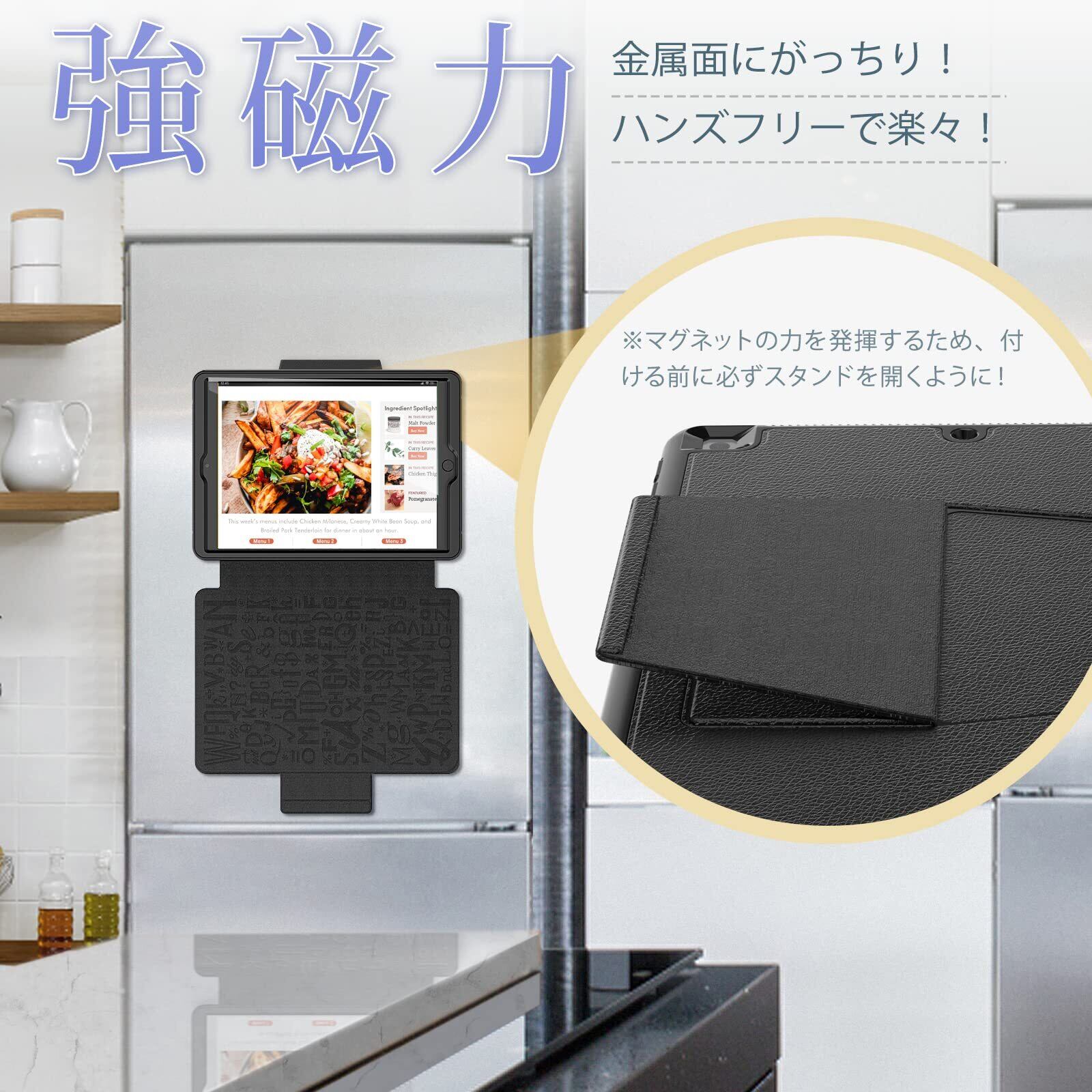 【強磁力】:強力なマグネットが内蔵され、冷蔵庫などの金属面にしっかりと付けられ、ハンズフリーで楽しめます。全体保護ケースは傷、落下や衝撃からiPad第9世代/第8世代/第7世代を守ってくれます。