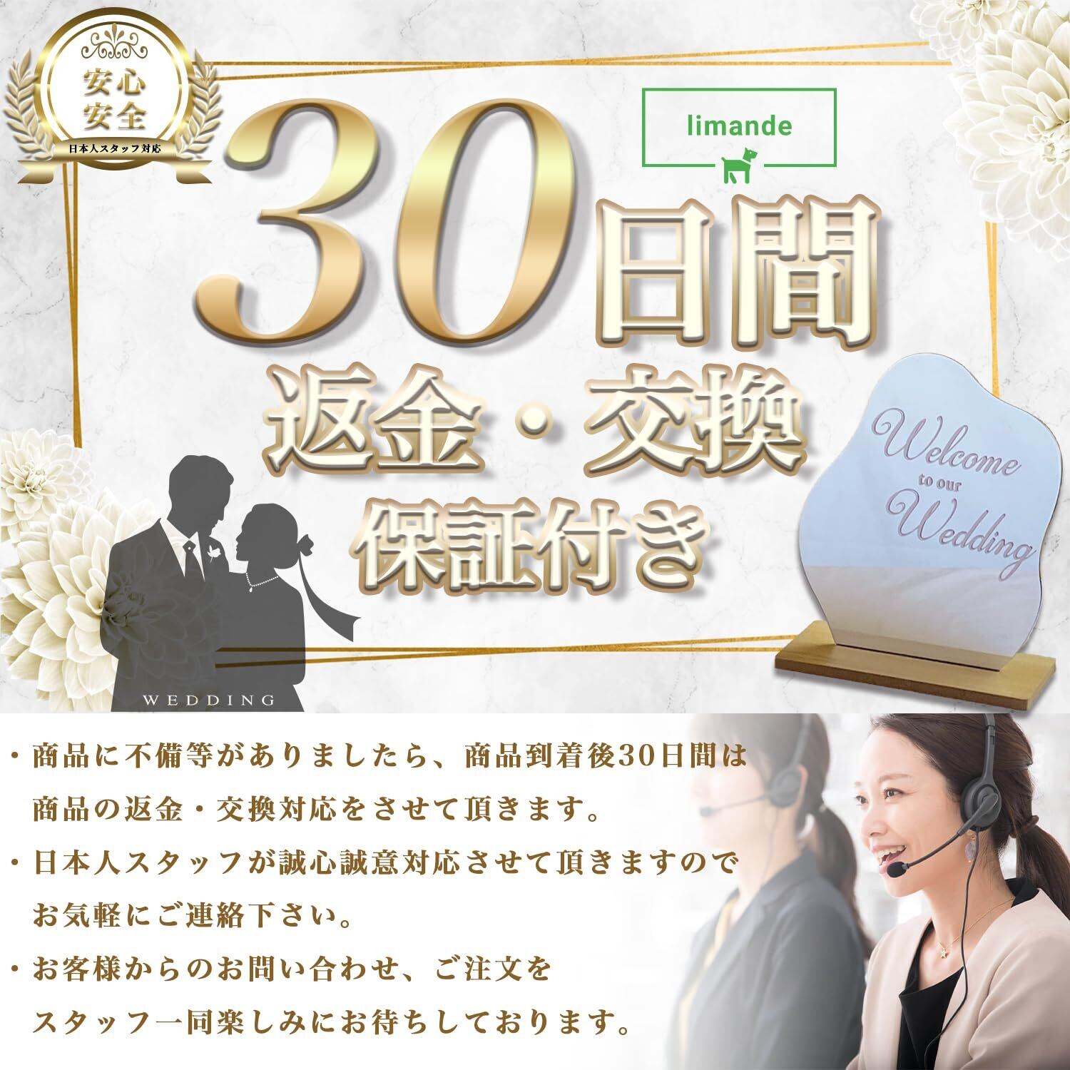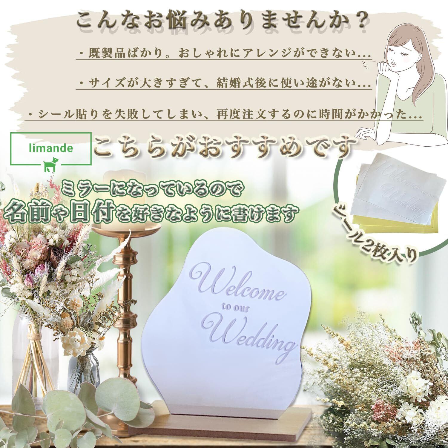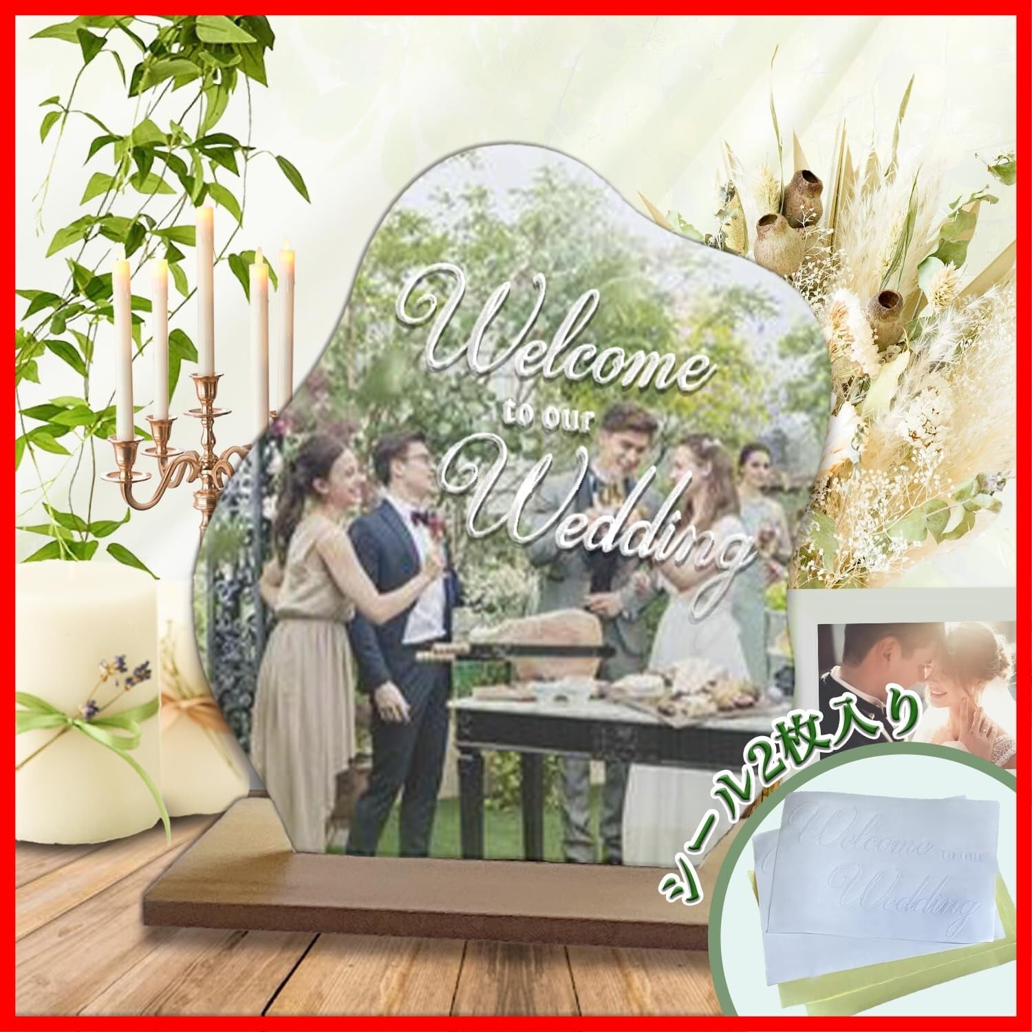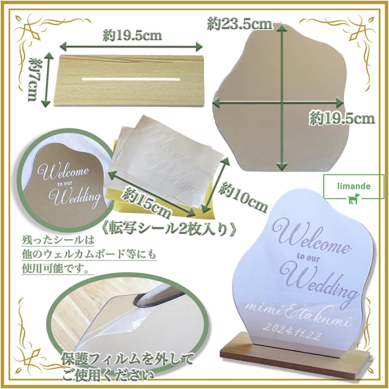 ウェーブミラー(アクリル素材だから軽量設計)、台座、転写ステッカーシール「Welcome to our Wedding」2枚付き。万が一失敗しても大丈夫!