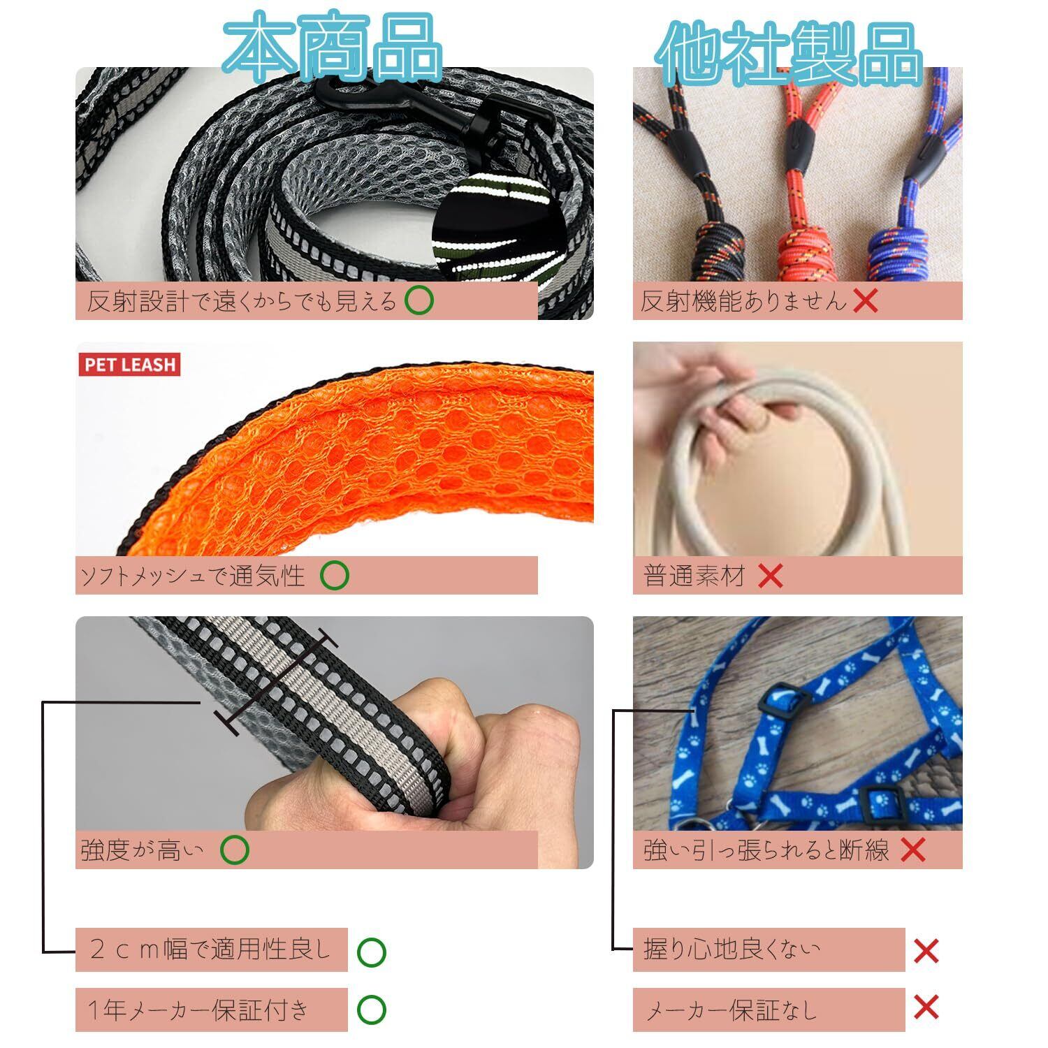 夜間の安全性: リードには3M反射ステッチが施されており、暗い夜道でも安全に散歩できるよう設計されています。この反射材料は光を反射し、夜間の視認性を高めます