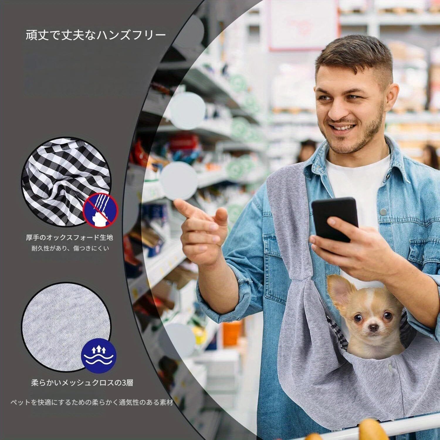 【快適設計】肩パッド&調節可能ストラップで負担軽減 3Dメッシュクッション肩パッド+5段階長さ調節機能。底板付きでペットの姿勢安定&長時間抱っこも疲れにくい