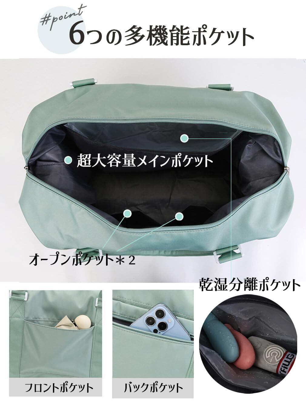 【たっぷり入る6つの収納】大きいメインポケット、中に乾湿分離ポケット、オープンポケット*2、外にもオープンポケットとファスナーポケットがあります。荷物の出し入れがとても便利です。
